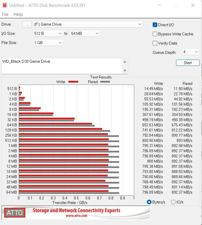 One thing of note is that the WD_Black D30 is a DRAMless drive. DRAM on the SSD allows the storage of a sort of “map” of where all of the objects on the memory cell are stored for faster access. Sounds like it would be incredibly important, right? Well, not so fast. In my testing I was unable to get any significant difference in read speeds on anything but the largest and most compressed file transfers. When pushing a single file weighing in at over 75 GB I began to see the smallest amount of speed degradation, but that’s not the use case for the D30. Even Call of Duty, notorious for massive file footprints, consists of a metric ton of very small files. Put simply, for read speeds, you aren’t going to see a difference with or without DRAM. Write speeds might be affected but only with large and sustained writes over time — again, not something you’ll normally encounter while gaming. Using a 1GB file size, I put that theory to the test using ATTO for a more in-depth look at write sizes over time.