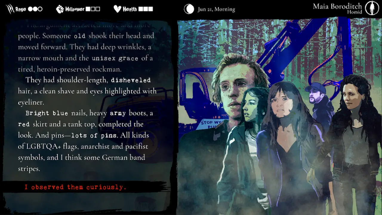 Werewolf is a game about rage and how it helps you accomplish certain goals, along with some things you regret to quote the opening lines. You’ll find Maia’s level of rage, willpower, and health at the top of the screen at all times, so let’s go through them in order. Rage at high levels can motivate Maia to take action, good or bad, but also makes her more difficult to control, i.e. some choices will be made for you, while low rage can help her be more analytical and see both sides of a situation. Willpower allows you to make difficult decisions, such as deciding to tell your friend the full truth about your dreams, but running out of willpower will make you impaired. Health is very similar to willpower, but allows you to perform physical feats instead with the same caveats when you run out. As you make decisions, you are constantly earning and spending these resources which then in turn passively affect other choices and factors like other people’s or a group’s opinion of you. It’s a simple system that allows for a huge amount of choice and consequence that feels like it matters. For example in one playthrough you may get a few characters killed along the way but ultimately succeed in your goals, while another may have literally everything go wrong and everyone hates you. It may only take a few hours to finish (depending on your reading speed) but the breadth of options and variations will make you want to come back for another playthrough or five.
