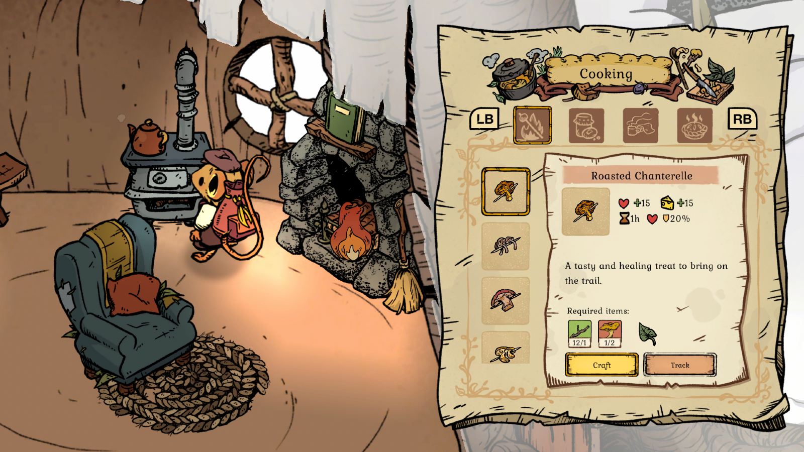 Other activities the mouse engages in are crafting and cooking. You’ll find resources like different types of wood, grass, and animal fur that can be crafted into items like tools and furniture. One of my disappointments with the game was a lack of decoration with aesthetics being separated into a few categories with the same type of furniture, a bed, table and chair. The furniture itself was cute, but I never found much incentive to go out of my way to decorate my burrow, lessening the feeling of it being a home I had created.