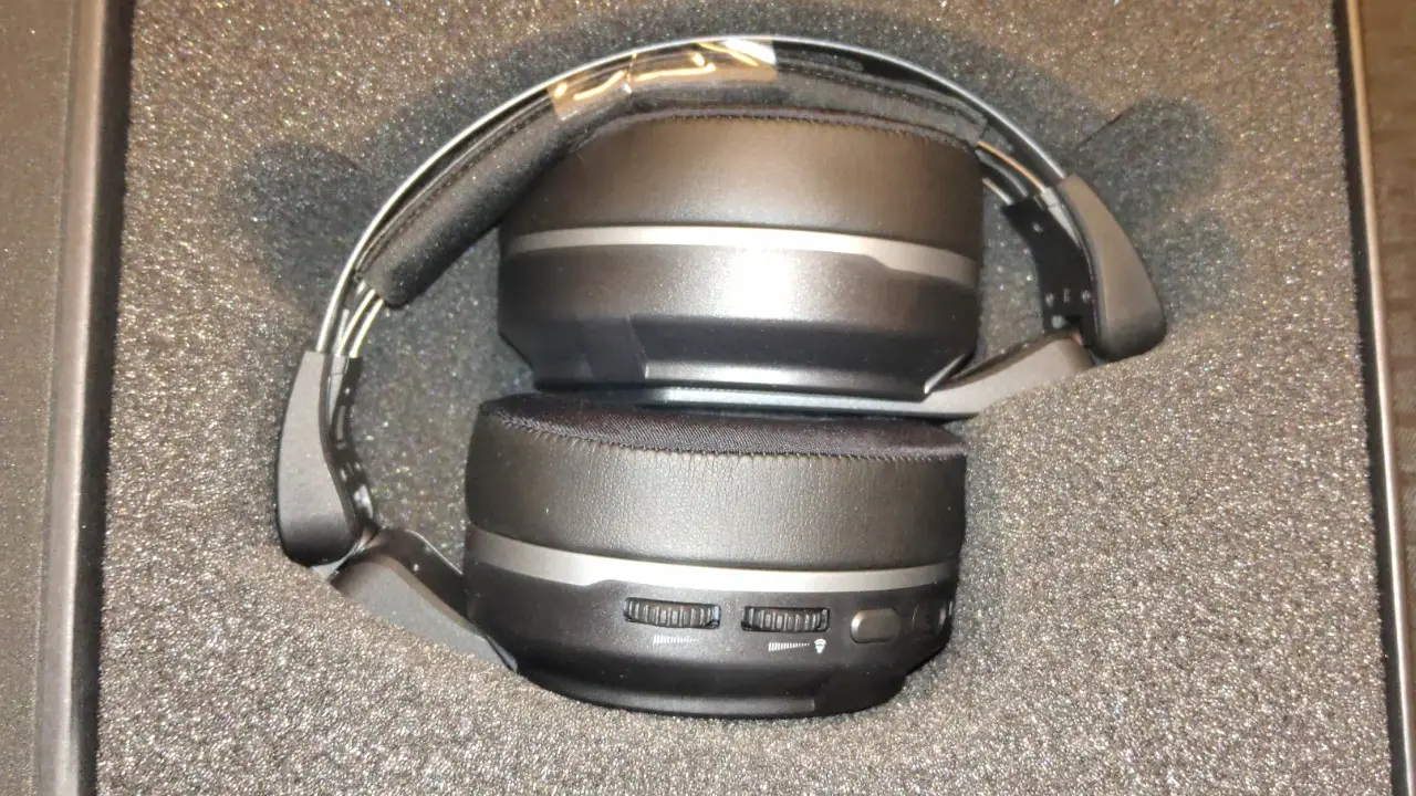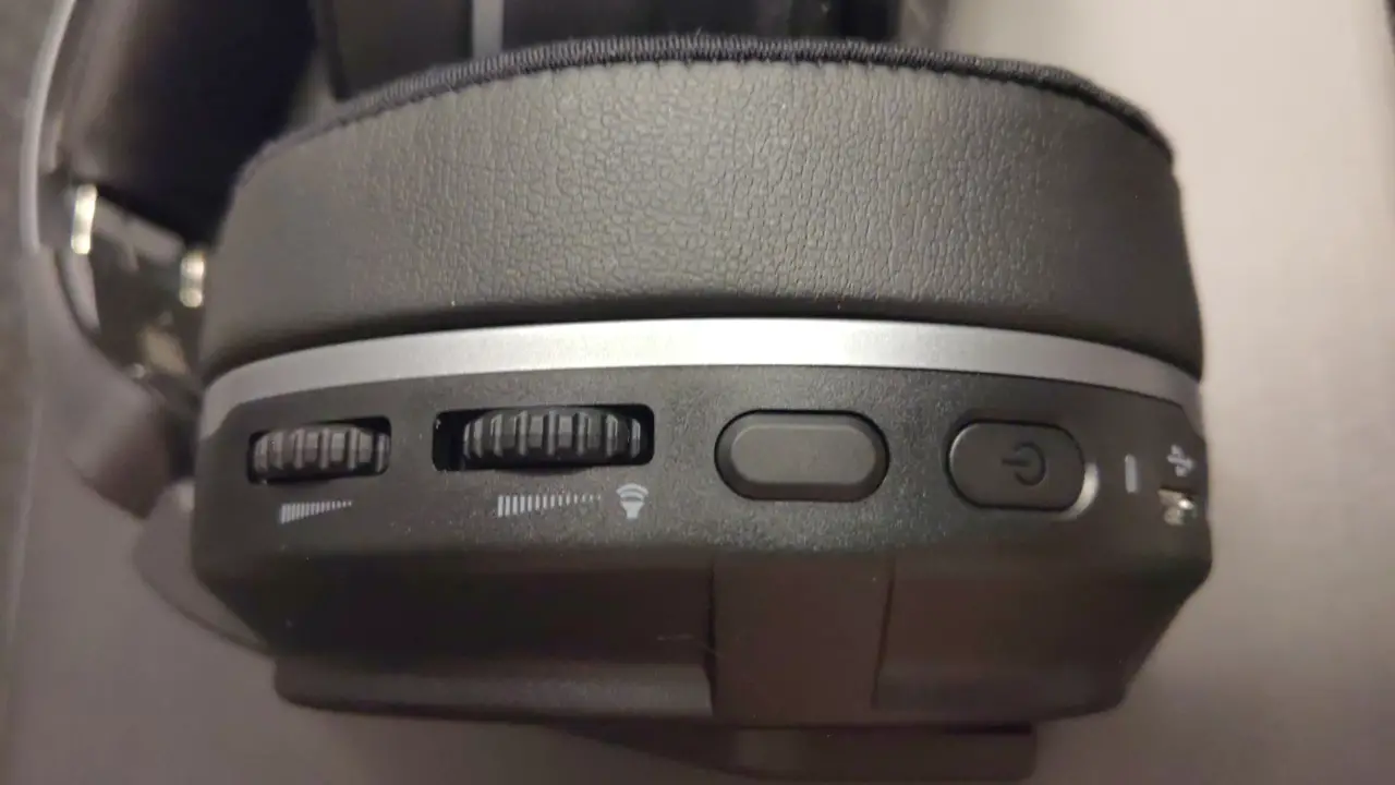 Making its way down the arms you see the secondary adjustments to the headset — the three-position points on the outside of the ear cups. Combined with the aforementioned headband adjustments make for a snug and comfortable headset that should suit most people (though I could see it being a challenge if you have larger than average ears). Speaking of the ears, the removable earcup pads are a small deviation from the Elite Pro 2. While the Elite Pro 2 had pads that were held on by magnets, the Elite Atlas Aero’s pads are held in place by four nubs that fit snugly in the body of the ear cup. It’s not a detractor, other than it means that they aren’t interchangeable. Similarly, the way the arms move up and down the body of the headset instead of inside of it, it also means that this headset doesn’t support the interchangeable side plates like the Pro 2 — I leave it to you whether this matters or not. That said, there is a nice little cubby to store the transmitter inside the right ear cup, which is pretty handy — small tradeoffs.