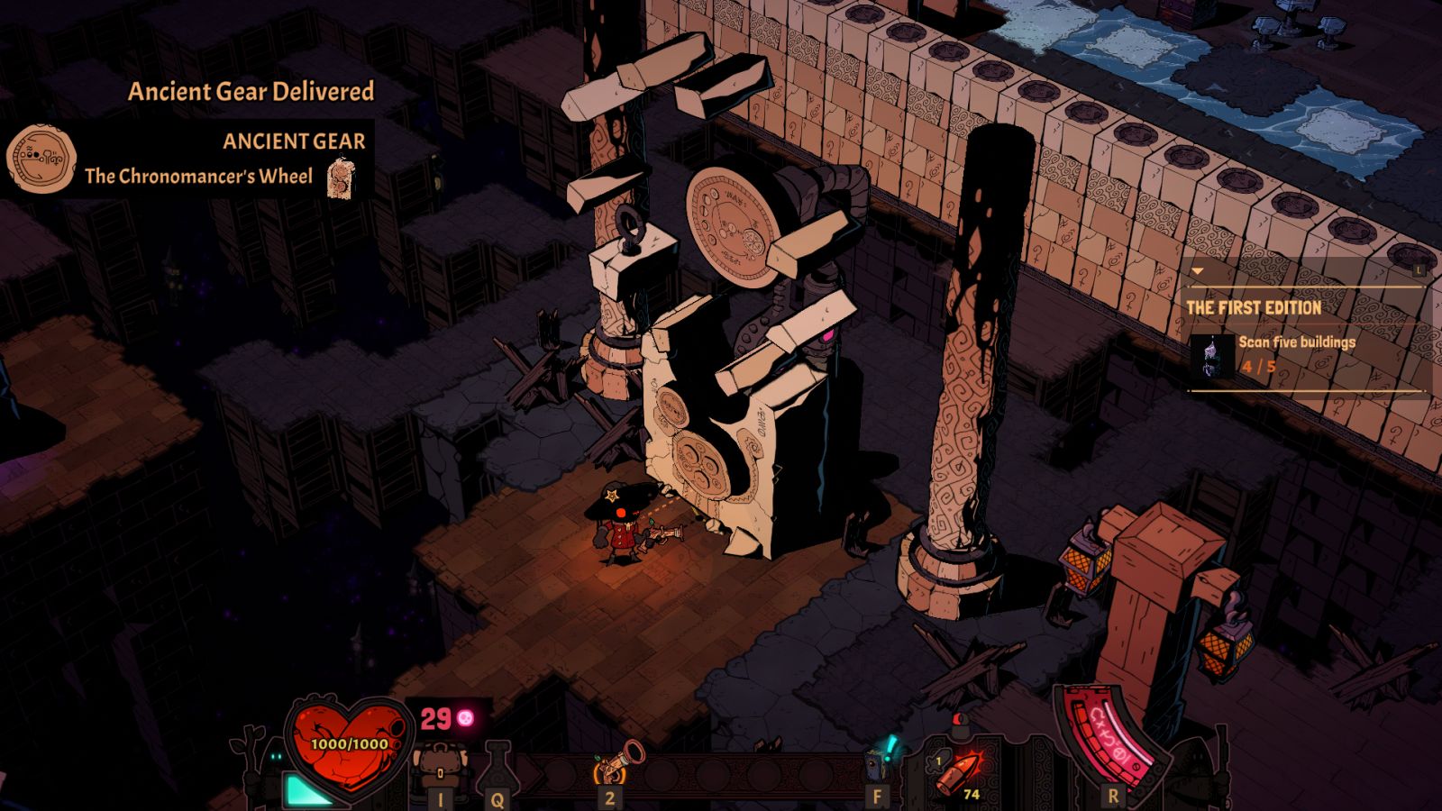 There is good news, you’re now in control of the tower, and it will serve as your base of operations. From there, you have direct access to the chronomancer’s wheel. The bad news is the riders have the gears that make the machine function, and they don’t trust you. You need to get the gears back from them, by force. However, the riders aren’t the only ones with gears, there are others with them throughout the map. This is the core gameplay loop: rewind the clock, explore the Shatter to hunt down the enemies with gears, gain enough gears to unlock a rider boss, plug the boss’s gear into the wheel, unlock a new biome, and finally, push the chaos back. Now throw into the mix that you have five minutes until the apocalypse starts after leaving the tower, and we’ve got a fun dynamic that’s less cat and mouse, and more like a cat, a mouse, and another cat in a burning building.