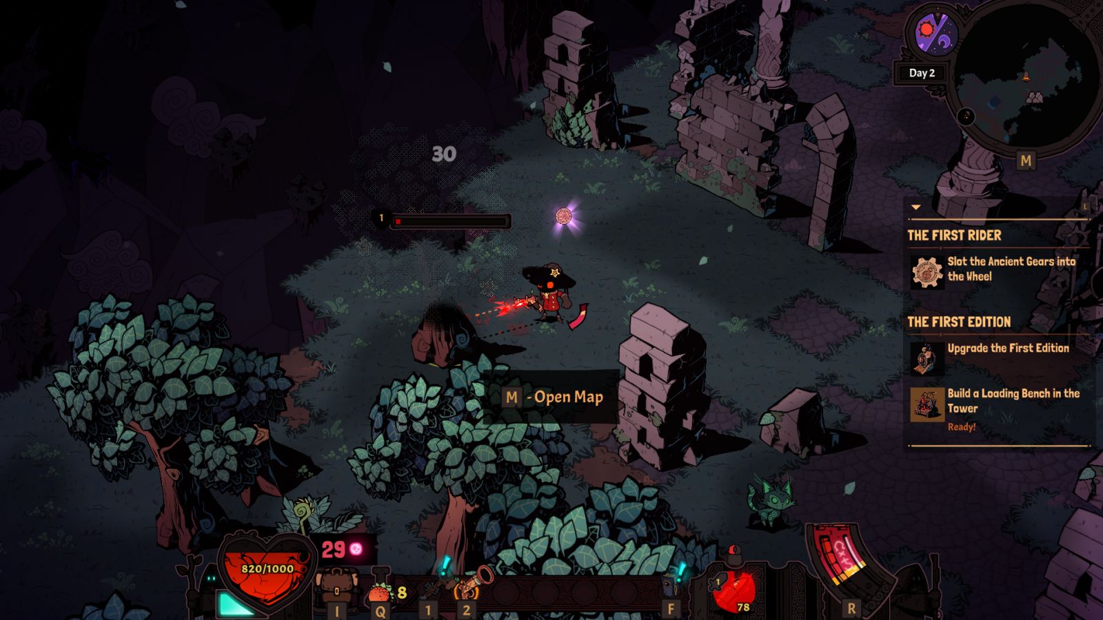From there the tutorial starts, and you have to find a gun. Before that, you learn to get about without one. This is where the dodge mechanic is introduced, a typical combat roll with generous I-frames. The first enemy you face is a stationary turret with mortar and missile attacks. I pridefully tried to beat it up with my bare hands, only to be humbled quite quickly. However, I soon came across some healing fruit, an oak apple, beneath a tree. I finally crafted a gun, made of wood. I appreciate the subversive take on the wizard’s wand. Guns are used for everything from combat to placing flooring and building whatever you need.