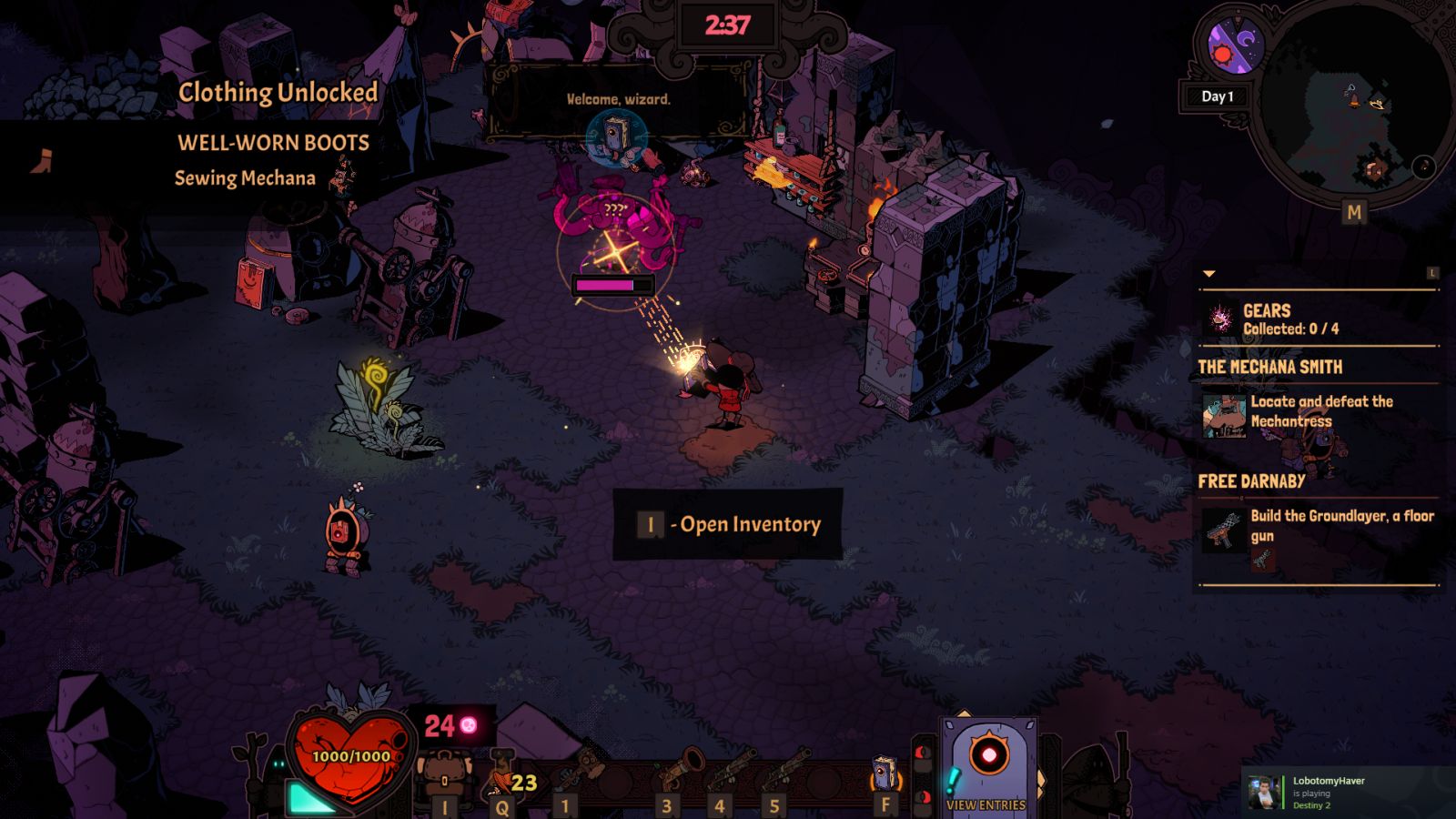 To wrap up, I need to talk about the aesthetics. The graphics are delightfully cartoony, yet surprisingly deep. Just how much personality can be imparted onto your wizard through basic character customization is an ode to the art design. Something as little as the eye shape can change your wizard’s personality drastically. Not to mention the abundance of outfit options and upgrades available at the sewing machine. Hats, gloves, robes, boots, and many more options can be altered to look the way you want and add buffs like health regen and faster movement speed. The silhouettes are also immaculate. Looking through the first edition at the outlines of enemies which I hadn’t researched yet was exciting.