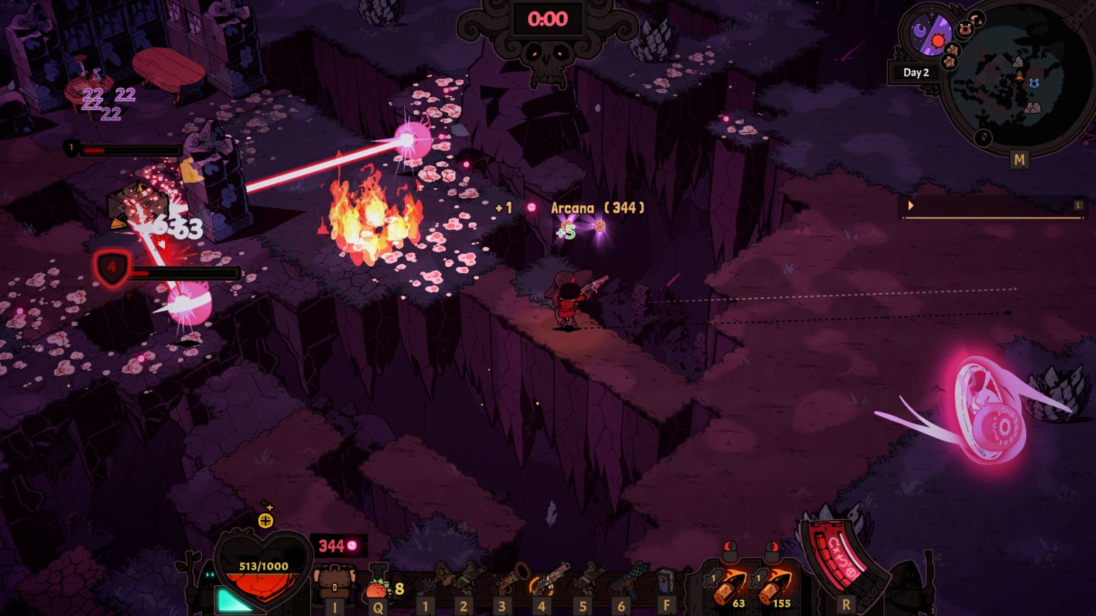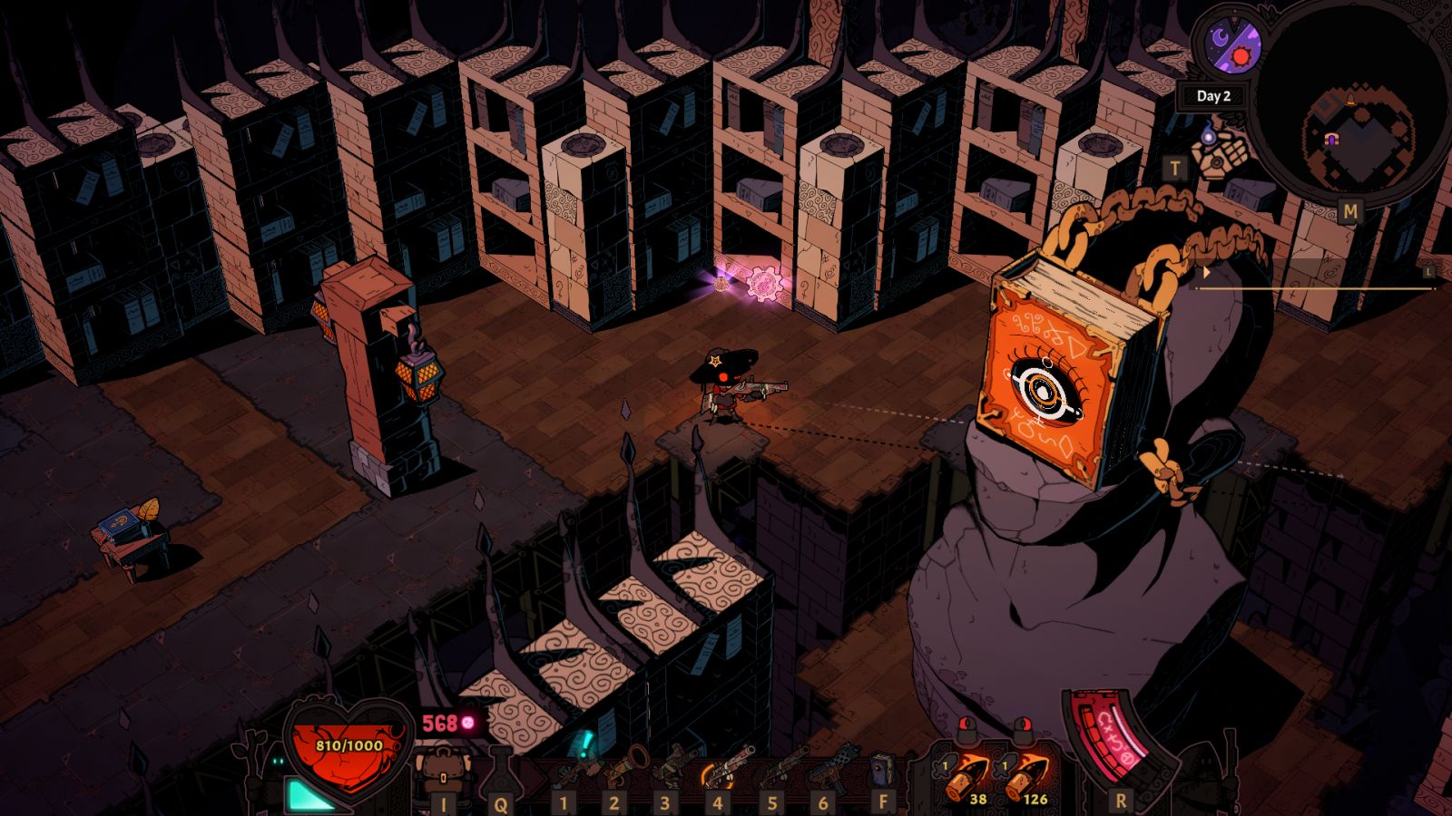 This all begs the question, how do I get more powerful guns, more spells, and better gear? Well, you’re equipped with a spellbook called “The First Edition.” It can scan enemies, allies, and decor to give you both new recipes and lore entries. You can then seek out Young Joshua, a gunsmith who will craft guns for you if you have the materials. However, bandits have stolen his blueprints, so you’ll have to face ever more dangerous gangs to get the blueprints for better weapons. The higher the quality of the guns, the higher the damage and the more powder effects you can have, meaning more room for interesting synergies. That being said, between elemental effects, attacks from enemies, and the environment deteriorating, sometimes the screen can get too visually noisy, and it can be hard to tell what’s happening and what to anticipate with all of the effects.
