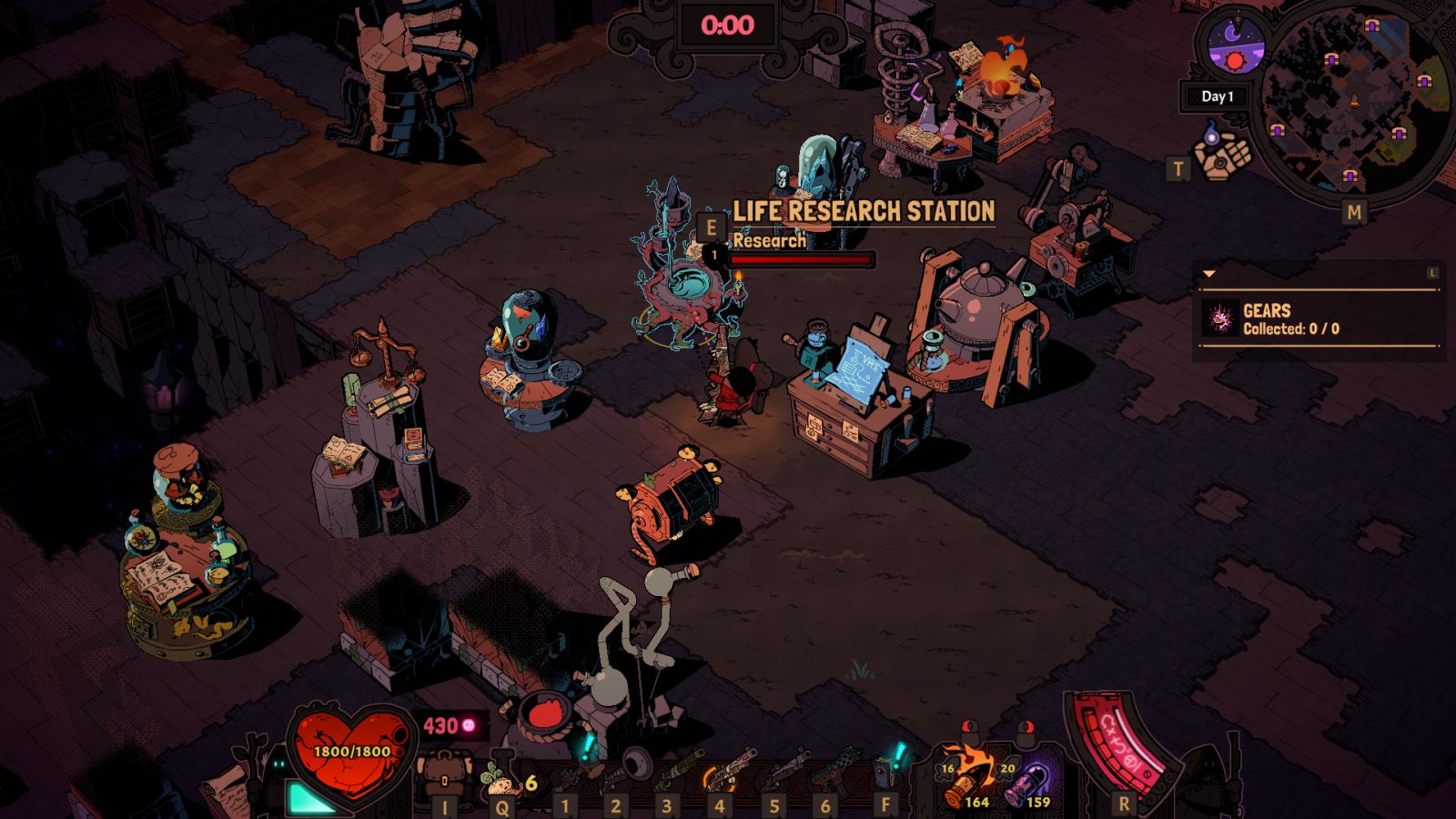 Now it’s time to talk about the tower. It’s your home, your research facility, and the place where the old gods decided to leave the chronomancer’s wheel. When you first get inside, the ground is ripped up, and you can see the void, revealing the tower’s status as floating through the ether. As you explore the overworld, you’ll find more portals that lead back to different parts of the tower. My tower took on the appearance of a spider’s web, with a main area where I set up all of my research stations, and the paths of wood winding out towards the portal rooms. Use the portals as leverage to spawn in a corresponding biome and get closer to objectives.