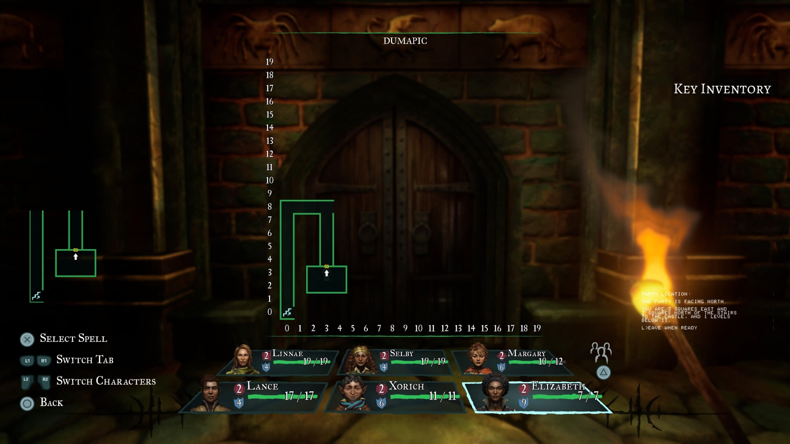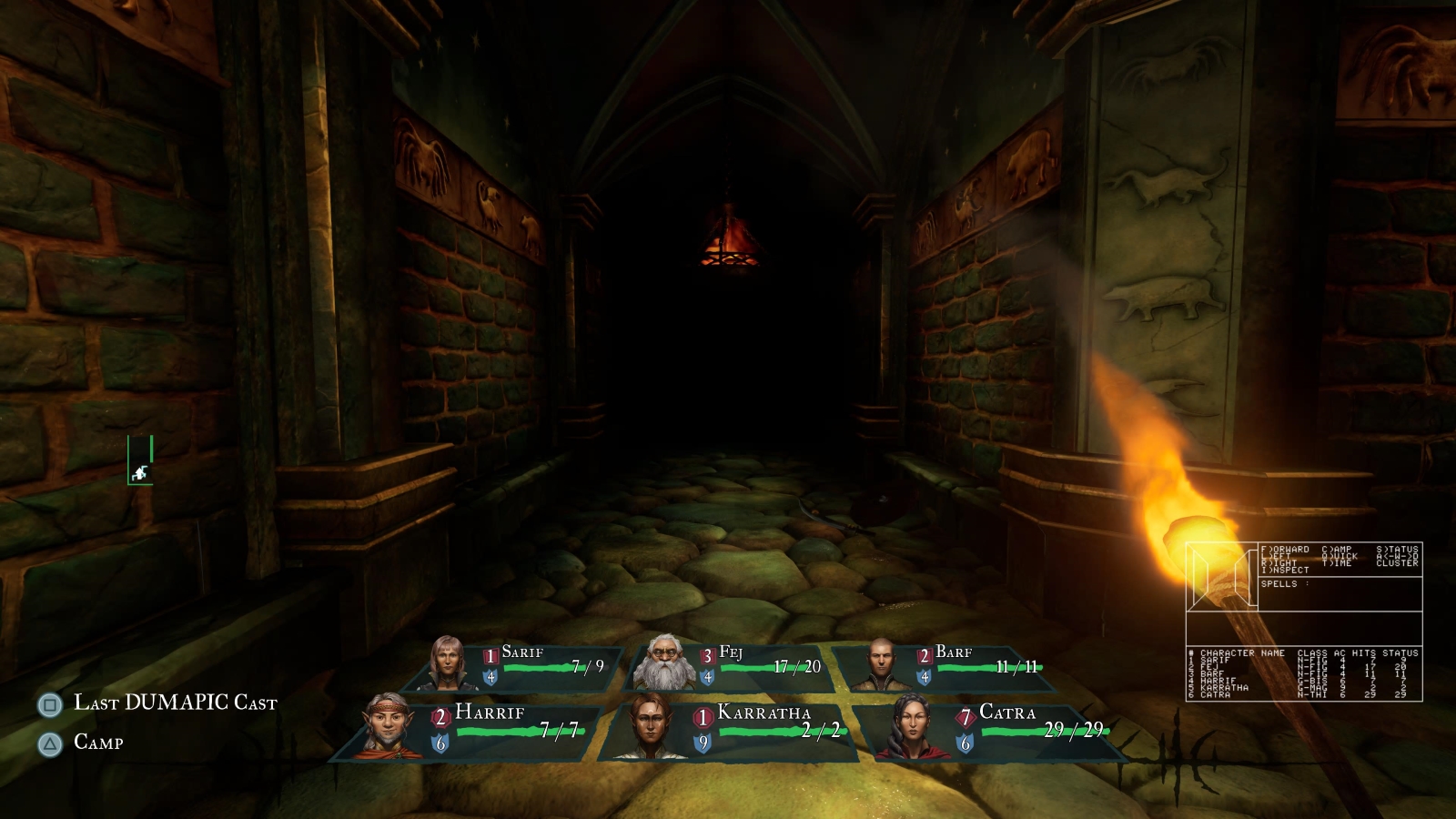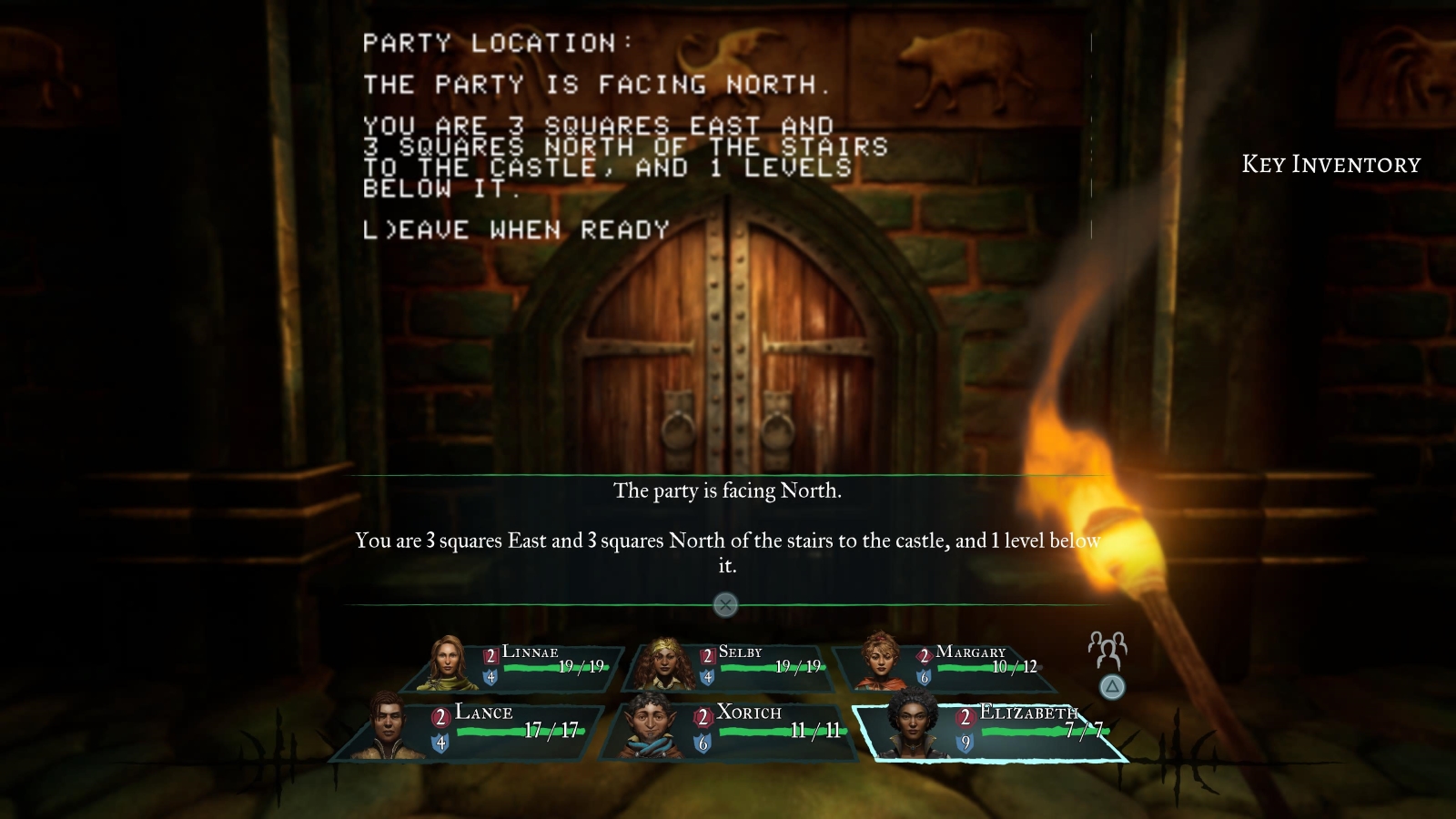 A mini-map in the bottom left unveils the fog of war as you travel, but it resets whenever you load the game or exit the maze. It can lie to you. When twisted by an illusion or trick, the mini-map will “eat” itself. It represents your characters’ immediate perceptions, not an omniscient point of view. A tile that rotates you 180 degrees will cause you to start walking backward, and the mini-map won’t correct you. That’s a nifty compromise.