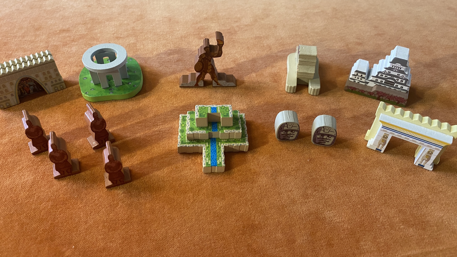 Well, it appears like they want to fix that problem, or they planned for it all along. The Mundo Wonders Pack comes with 9 new monuments. They are excellent painted wooden pieces, just like those in the base game. Each has a monument card that you can shuffle into the base deck. This pretty much solves the problem of running out of monuments, or at least lets them last longer, while adding some more variety as well.