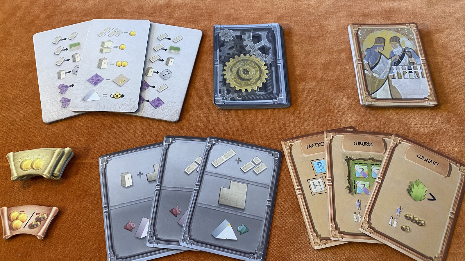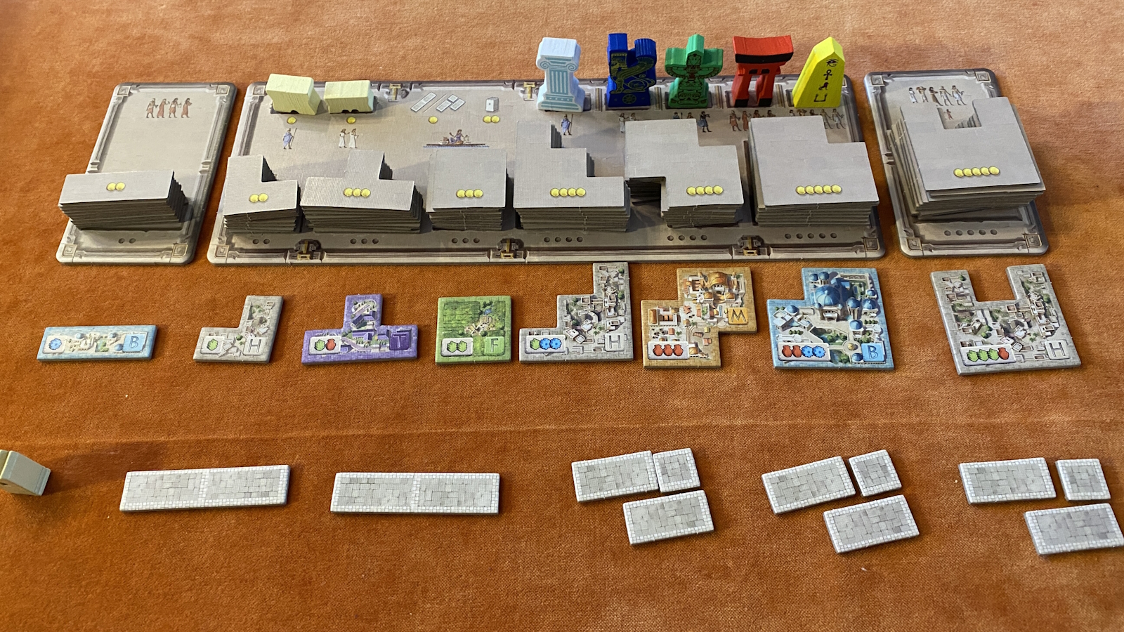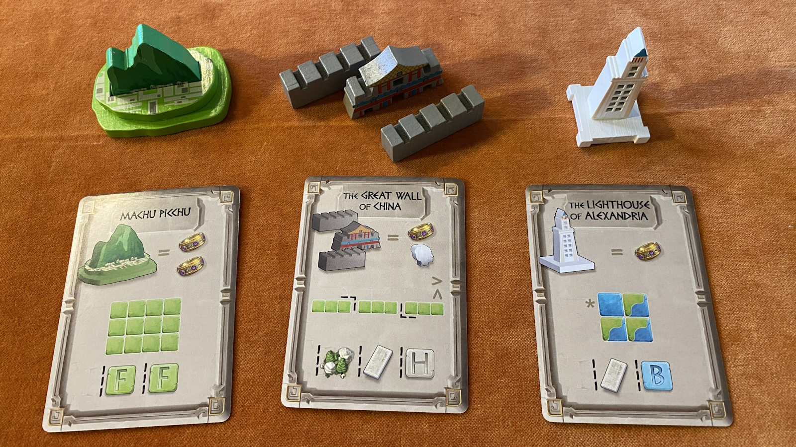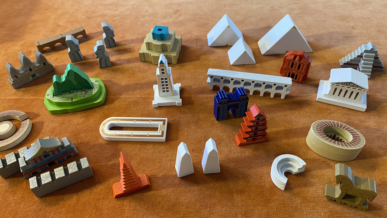 The monuments are obviously supposed to be the centerpiece for this game. They are nicely crafted and painted wooden pieces. There is some occasional sloppy gluing, but not enough to bother me. The pieces look nice when spread out across your sprawling city.