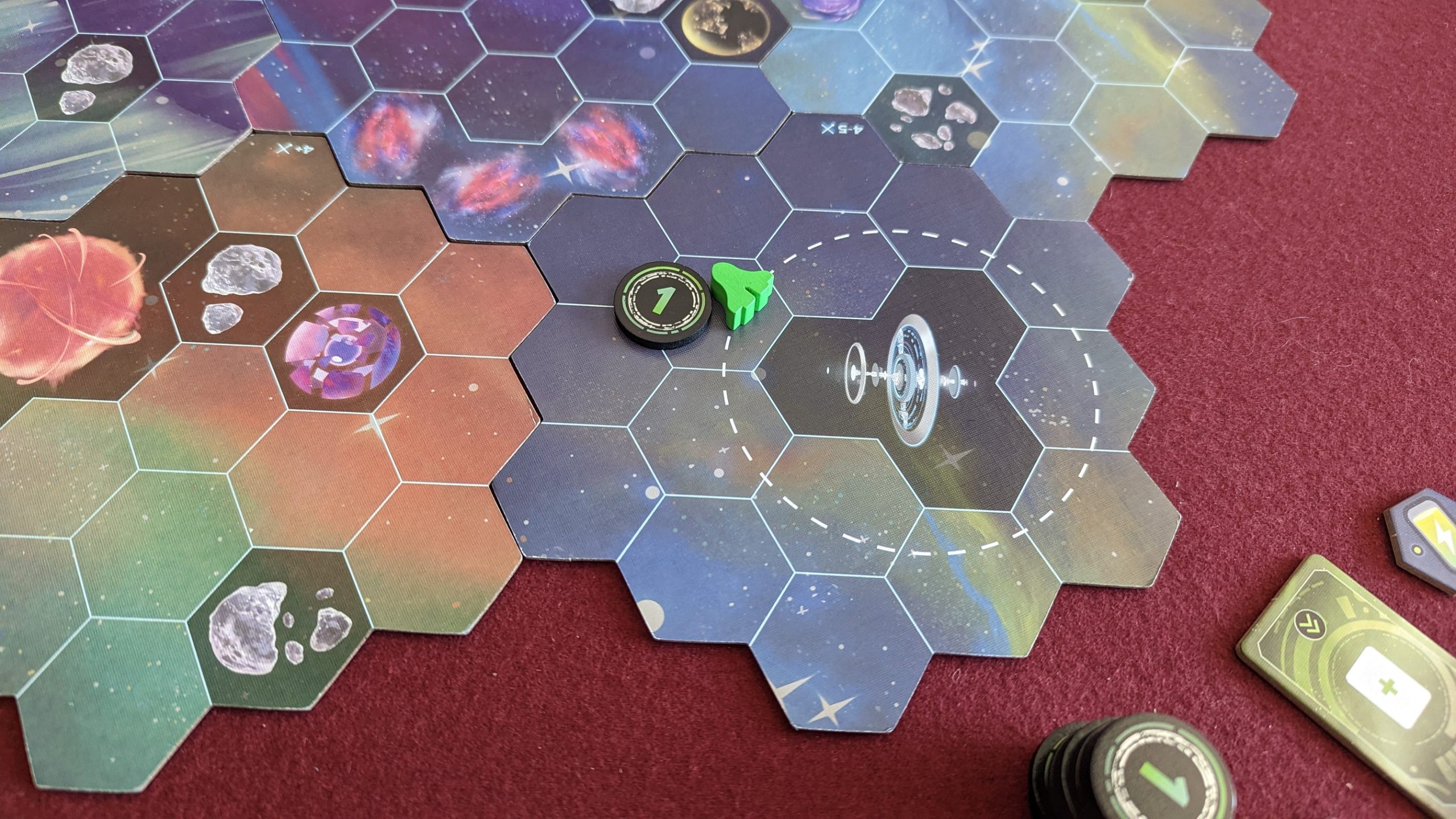 Turns in Wormholes are simple enough to go faster than light. Ships have the juice to move three hexes a round, unless they’re swapping from one side of a wormhole to another, potentially giving another player a victory point for using their wormhole. Players can drop a paired wormhole token on or adjacent to their ship whenever they like. Players can randomly draw passenger cards off the deck when they’re adjacent to a planet, or take their choice from the discard if they’re adjacent to the space station, up to the hand limit of four. Finally, if a player is adjacent to a planet, they can deliver any and all matching passengers in their hand, adding them to their scoring pile.