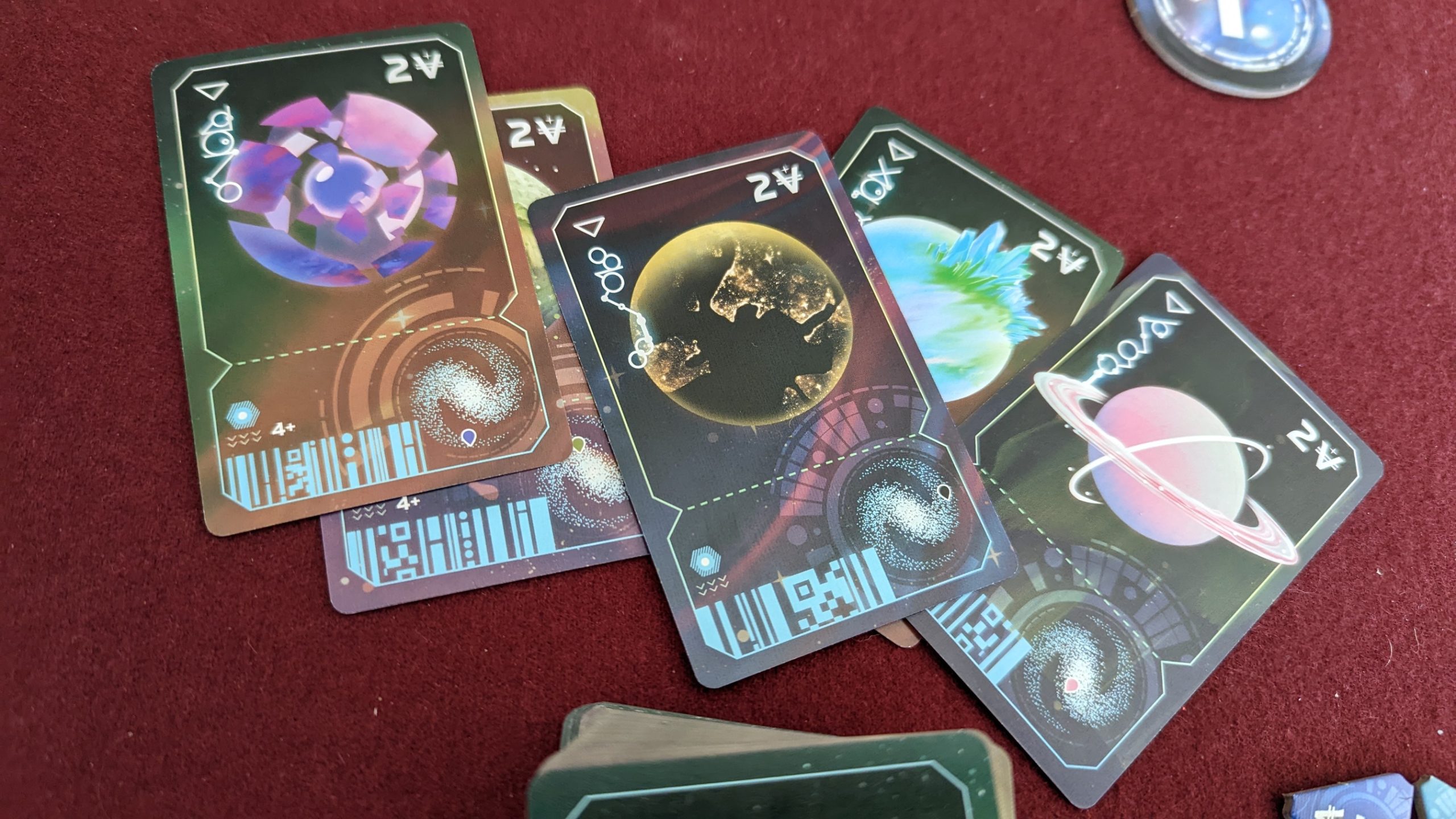 Scoring is equally simple. When a player opens a wormhole adjacent to a previously unconnected planet, they take the top tile off the exploration stack, which I probably love more than is reasonable. As the stack dwindles, tiles’ worth escalates, encouraging players to connect planets that were too inconvenient for other players. Eventually, the final planet will be connected, triggering the final three rounds of the game, tracked by the final three tiles in the stack. At the end of the game, every passenger in a player’s stack is worth two points, with an additional bonus for every unique planet they delivered to past five.