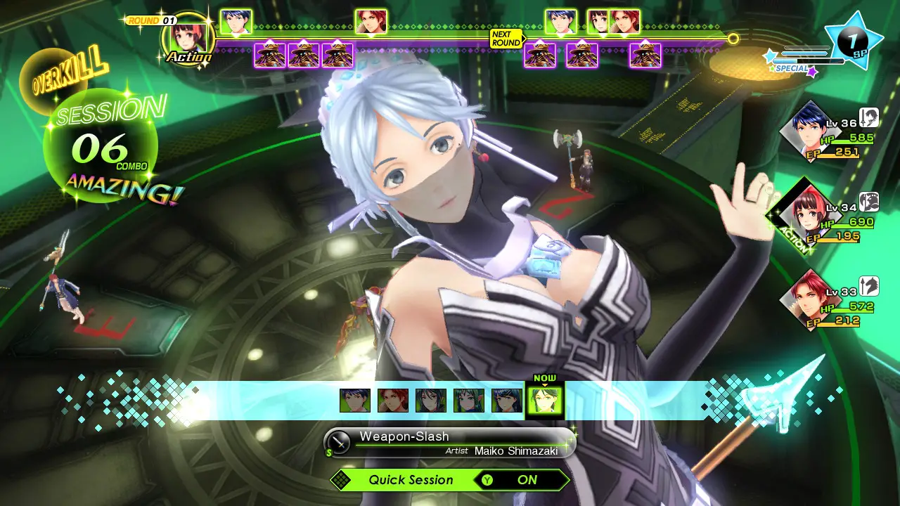 The combat is what holds all of these systems together. It may seem pretty typical for an SMT or Persona game; it’s turn based, enemies and characters all have weaknesses to be exploited, but what makes this one of the best combat systems I’ve played in a long time are the Sessions. After hitting an enemy’s weak point, other characters will jump in and attack one after another. At first, this is just limited to whoever is active in your party and you can’t change targets in the middle of a Session, but later on inactive members and, new to Encore, characters who don’t even join your party will all join in on the Session. The fun comes from setting up a long combo to decimate an entire enemy party in a single action. You have to carefully decide who to attack and when to get the longest session you can, since defeating an enemy after you gain the ability to switch targets during a session will put you in the Overkill state, which ignores enemy resistances. For example, you could encounter a boss whose weakness doesn’t give you a very long combo. The best strategy then is to defeat the additional enemies they summon to Session on the boss and get as much damage in as you can. It’s an interesting and most importantly fun battle system that just gets deeper and deeper as you progress, with things like crossover attacks activating at the end of a Session then immediately starting another one. The highest combo I’ve gotten so far has been 22 hits in a single session, and even after beating the game I can’t wait to go back and see how high I can push that number.