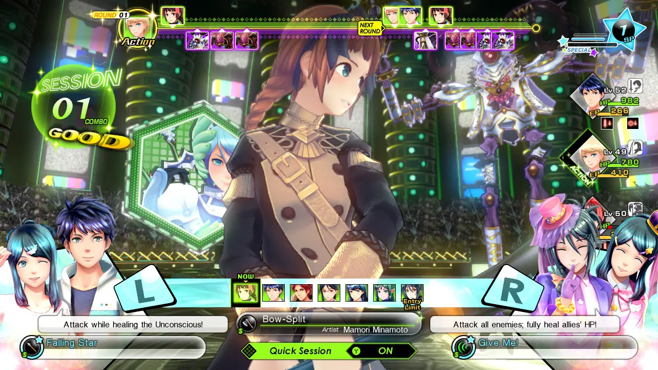 Tokyo Mirage Sessions isn’t all sunshine and roses though, there were a few things that bugged me. Sessions can go on a bit too long, especially since they happen every turn. The new Quick Session toggle remedies this slightly, but it can still make combat feel slower in normal encounters. The removal of the gamepad comes with the addition of a minimap, which can make the screen feel cluttered at times. I also wish there was more gameplay to do with working in entertainment. My biggest problem, however, was with the main character Itsuki. He just doesn’t do much in the story, has almost no personality aside from being nice, and everyone likes him as soon as they meet him and praises his skills. He’s basically the definition of a Mary Sue, as much as I dislike that term. Most of the story revolves around Tsubasa’s growth as well, so why are we playing as this guy? Usually, I really enjoy stories where you’re not the protagonist, like Tidus in Final Fantasy X, but in this case Itsuki eternally feels like a third wheel, even in battle. Since he’s the main character, you can’t switch him out of your active party, and it can get pretty annoying when he can’t really contribute or exploit a weakness to start a Session in some battles.