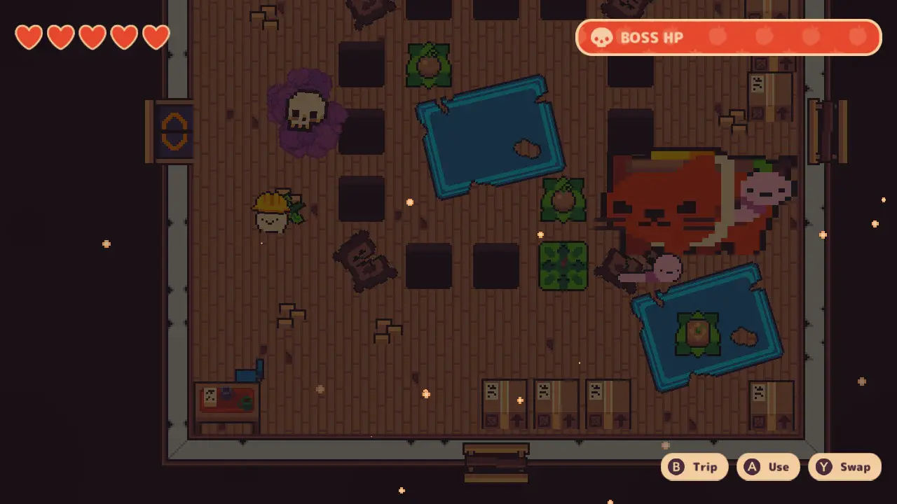 Meanwhile, the gameplay is serviceable, with it playing like a Metroidvania-lite. If anything, I’d probably compare it to Minit, where you have an overworld that you can explore, though you’ll have to follow the orders from Mayor Onion, which means you’ll be stuck on a set path for most of the game. There are different documents you can collect, which are promptly shredded by Turnip Boy. In this world, everything is forcing you to remember the sin of neglecting your property tax, so I understand why our little vegetable truant doesn’t want to be reminded. You can also get cosmetic hats by doing little sidequests for random NPCs.