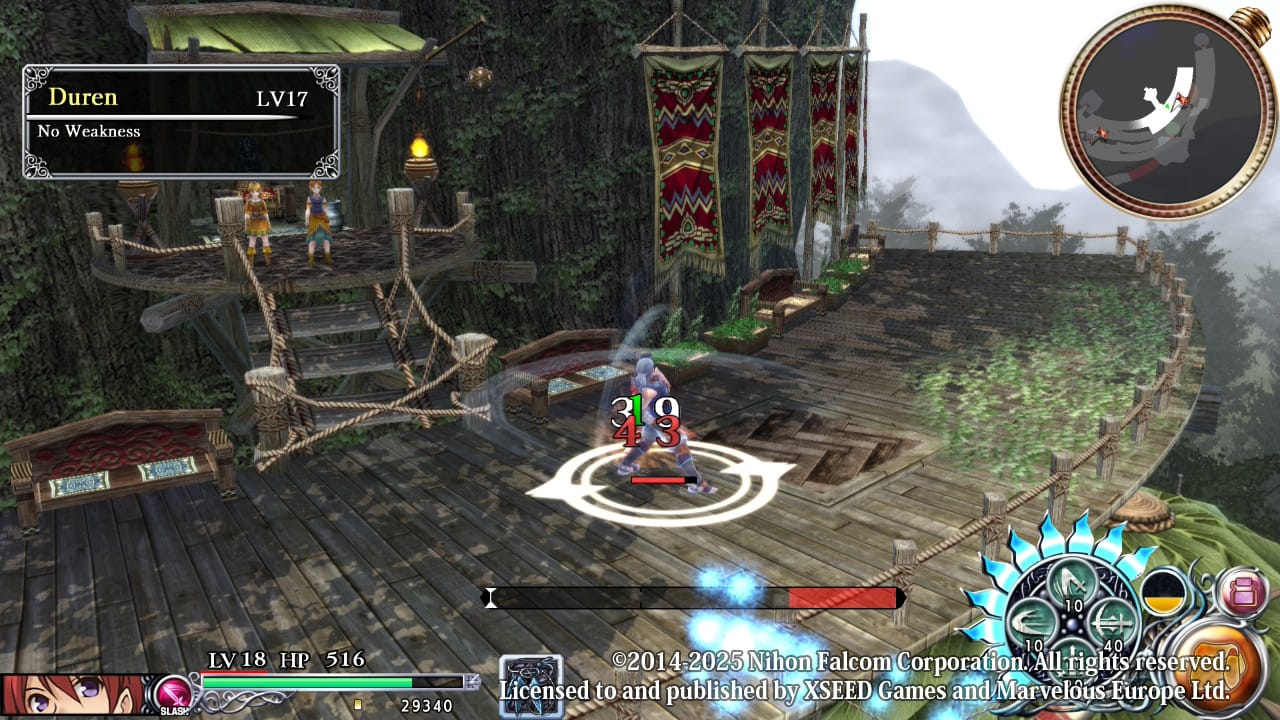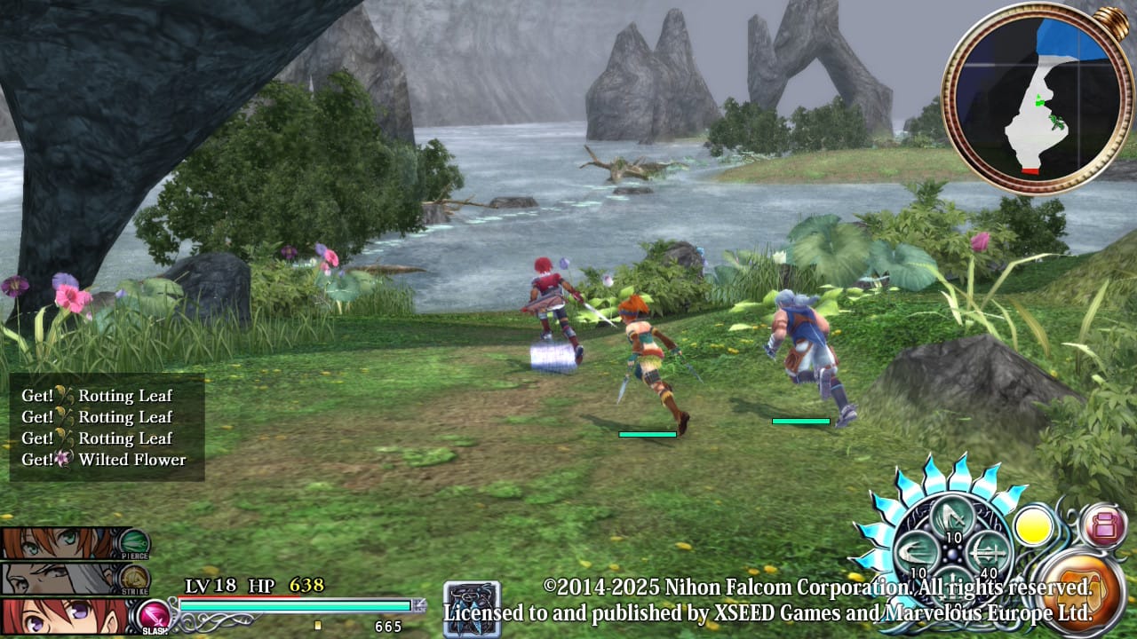 Gameplay is what you would expect from the majority of Ys games. You have a party of up to three characters, each of which have one of three attack types: slashing, piercing, and blunt. Some enemies will be weak to one of these damage types and resistant to others, so it's important to keep a balanced party. As you get further into the game, however, these damage types start to matter less and less, since any character can sufficiently damage any enemy enough to take them out quickly and some foes just don't have any weaknesses/resistances. I don't find it that much of an issue though, as characters still have unique stills, both in and out of combat, that set them apart. For example, Duren has powerful punches and kicks and can also pick open otherwise inaccessible chests. You can swap party members in and out at will, so pick whoever you like and then swap others in as needed.