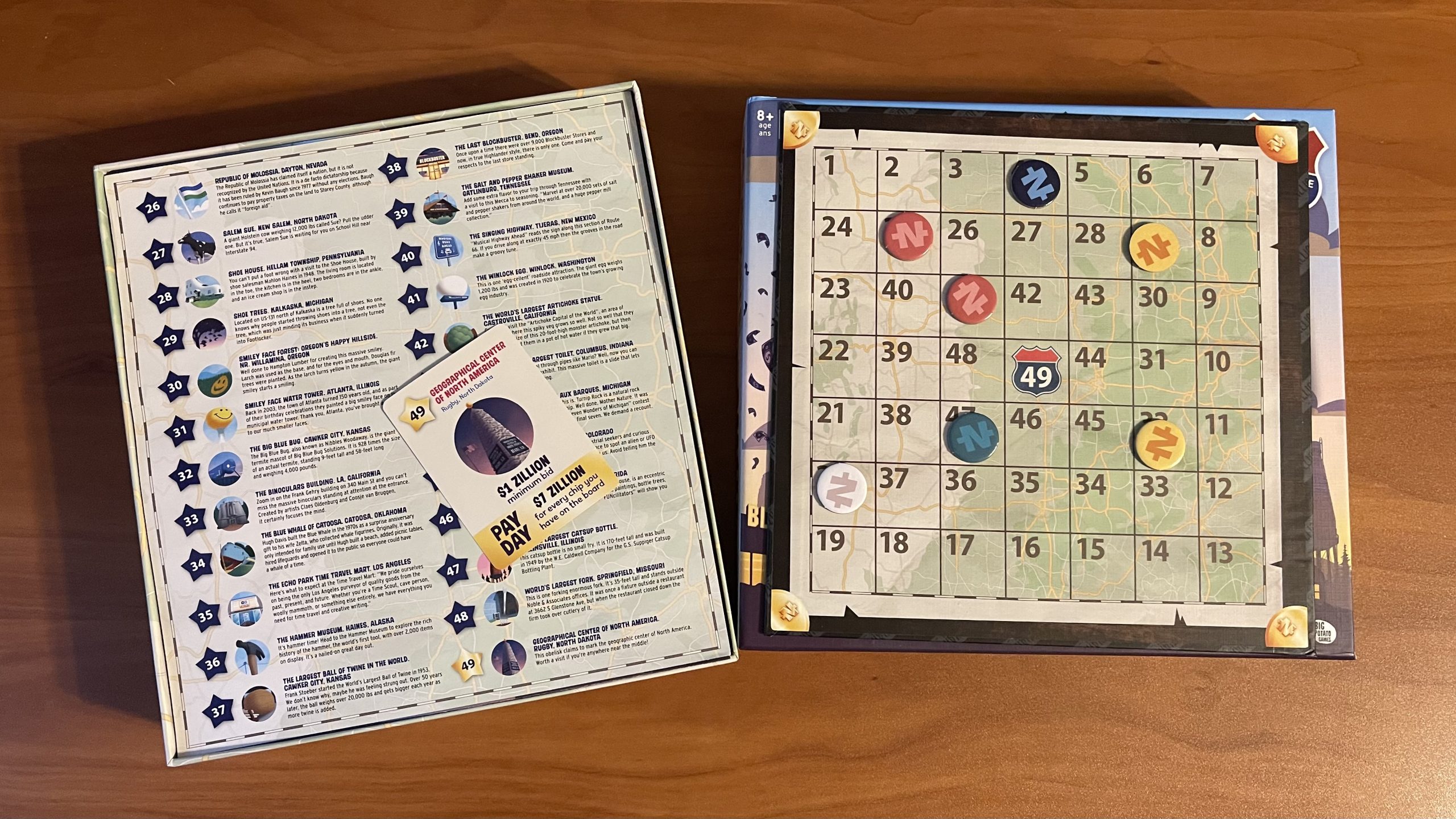 The other cards you’ll find in the deck are Pay Day cards. The Geographical Center of North America is a Pay Day card and then there are 7 additional Pay Day cards. Whenever a Pay Day card is drawn, players will bid on that card, with the winner claiming an available attraction within the Pay Day card’s range. For example, one of the Pay Day cards lets you claim an attraction between numbers 1 and 24. But this is also Pay Day, so it doesn’t end there. At the conclusion of the bidding process and after the attraction has been claimed, everyone receives $7 Zillion for each attraction they’ve claimed on the board, however, this is capped at $49 Zillion. Can’t break the bank, after all.