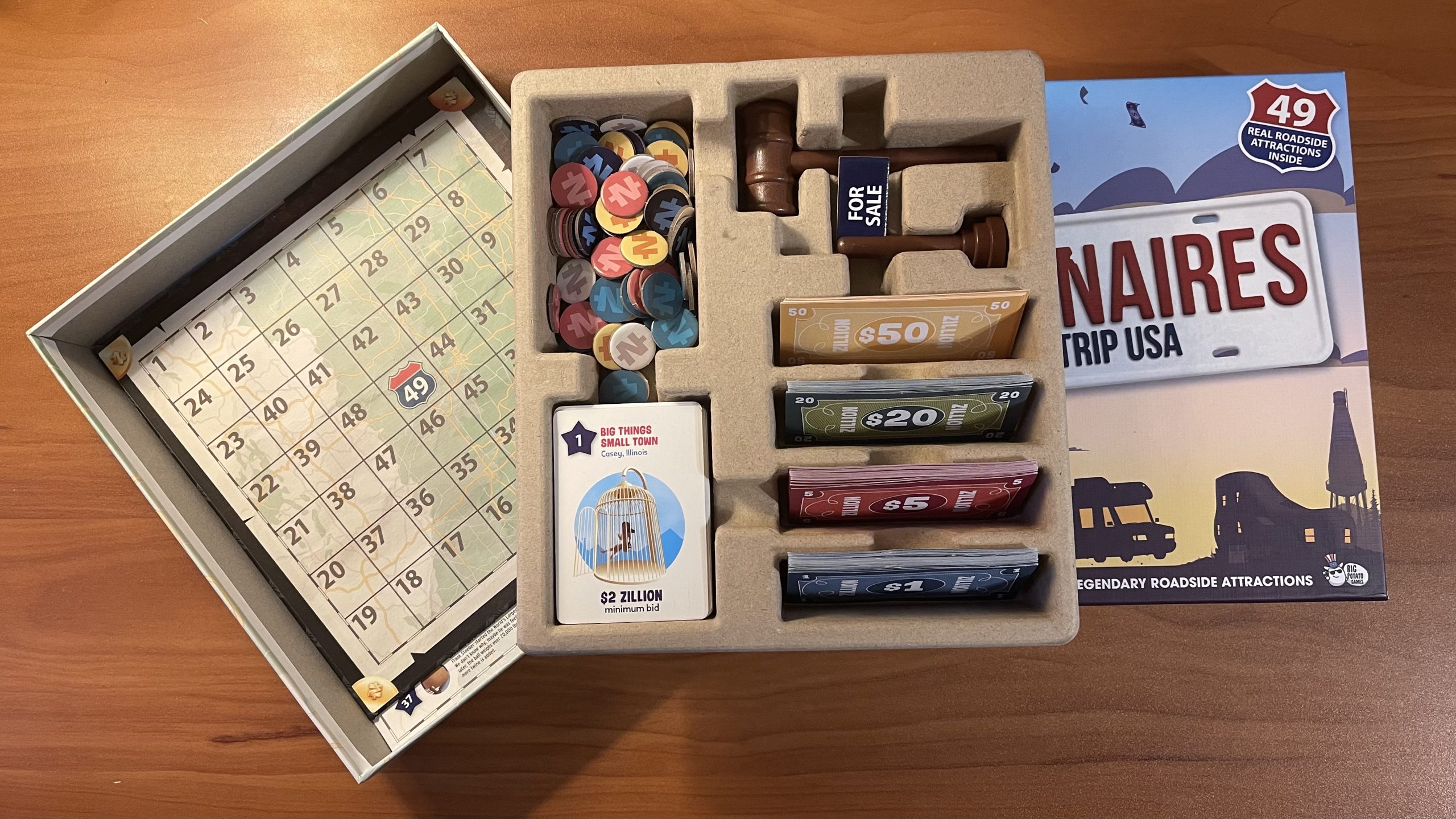 I was very pleased with the overall quality of the different pieces of the game. The board itself is decently sturdy with the attractions numbered in a spiral with 49 at the very center. For those who like fun facts and trivia, there’s a 2-sided insert included that gives a brief description of each of the attractions as well. When an attraction is drawn, a little For Sale sign is placed at its position on the board, and there’s also a small gavel that’s supposed to be whacked on the table when the attraction is sold. We did not do this. It is annoying.