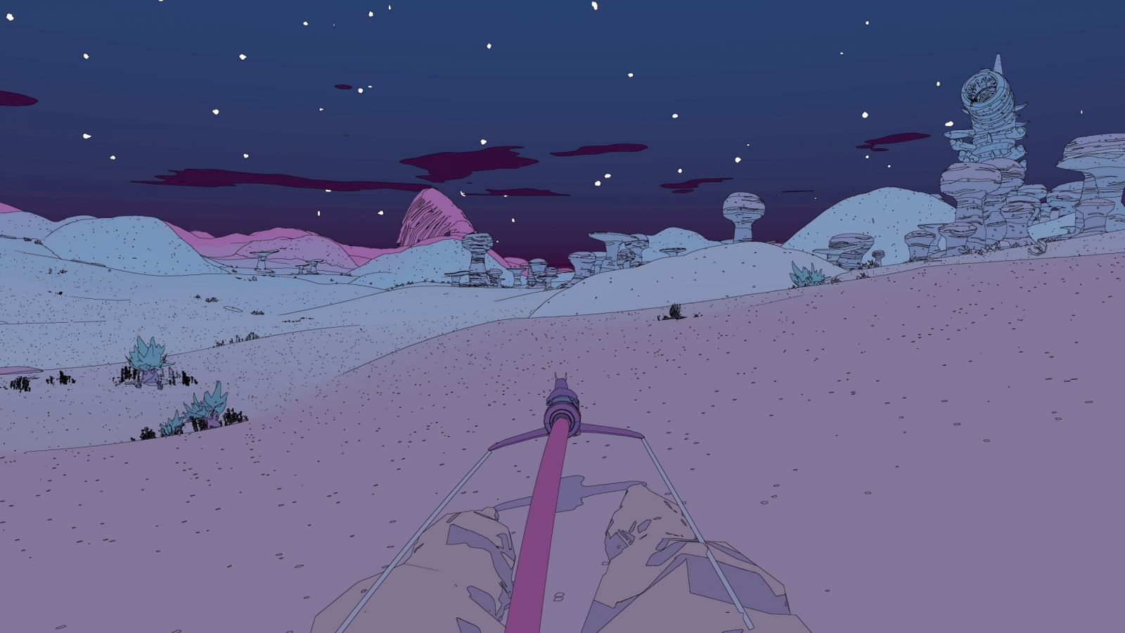Speaking of the fog, Sable is a very colorful game but will occasionally use a single color for some areas. Despite the clear, black outlines of every character and object, this can make it difficult to see or perceive depth, especially at night. It works well in some places, like the lower areas of the lightning crystal plateau or in the mask making tent, but when it rears its head in some places like caves I had trouble making some jumps or figuring out what I needed to do to solve a puzzle. Most of the game is filled with incredible, vibrant colors though, so I wish this technique was used a little less often.