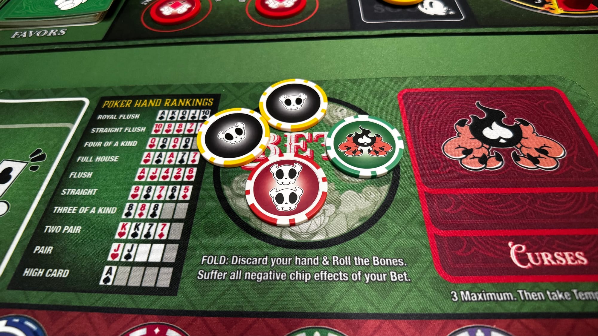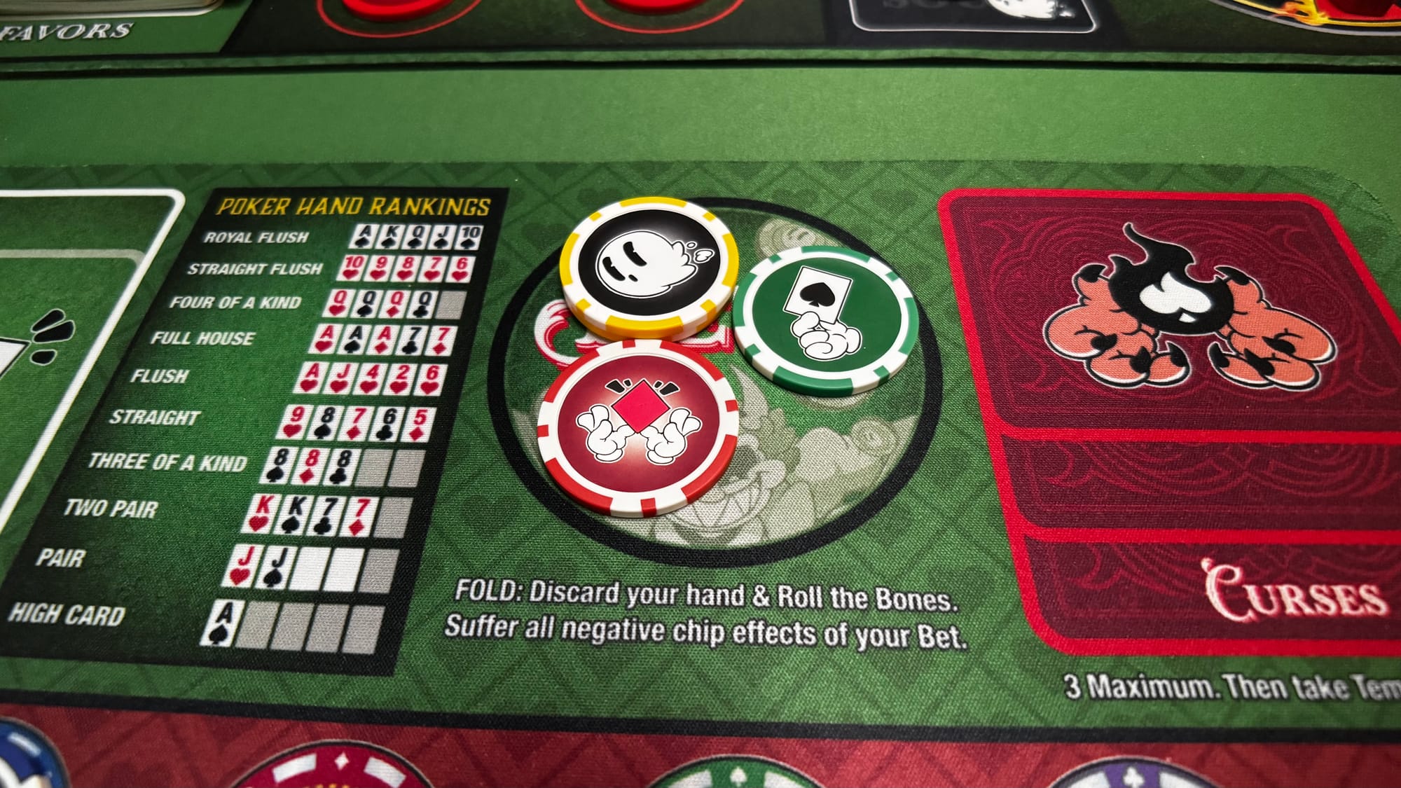 Just like in standard poker, each player will be building their best possible hand out of their pocket and the board, and hand hierarchy is exactly the same. In fact, each player mat lists all of the poker hands and their place in the pecking order. While there may be some boss abilites or Favor card abilities that can change or add to this situationally, the core mechanic remains untouched.