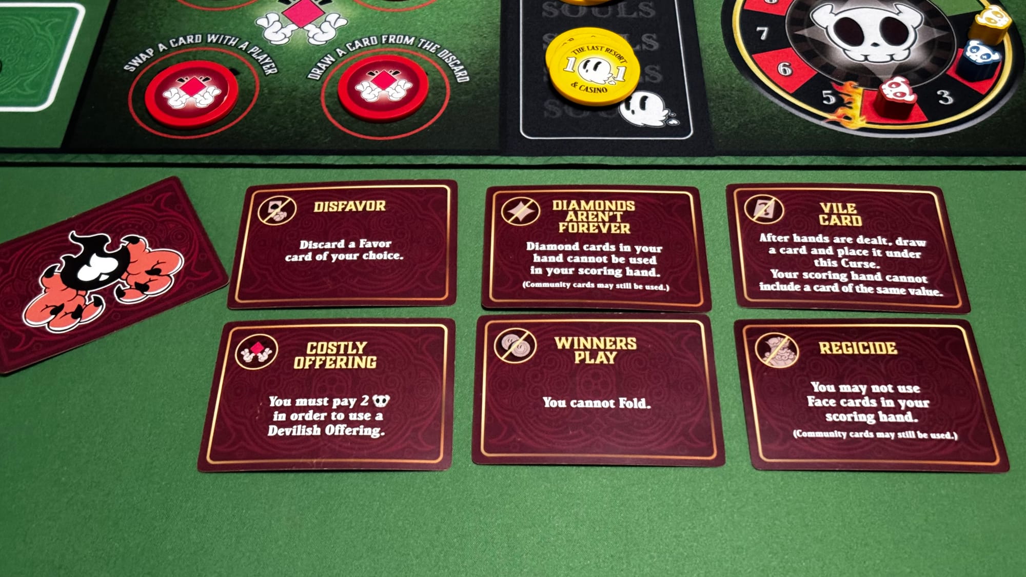 Even casual poker players figure out pretty quickly that every card on the table that is face up is actually very valuable information, specifically information about which cards are not in your opponent’s hands, or sometimes regrettably aren’t left in the deck. In Hell of a Deal, not only is the discard pile—which includes every burned card, I should note—face up and public knowledge, there are Devilish Offerings and Favor cards that allow you to take or swap cards from the discard pile. Rarely was there a hand we played that one of us couldn’t spend our Devilish Offering chip to swap a card and make a winning hand. The more likely scenario saw multiple players that could do it, but only one player can use the ability…