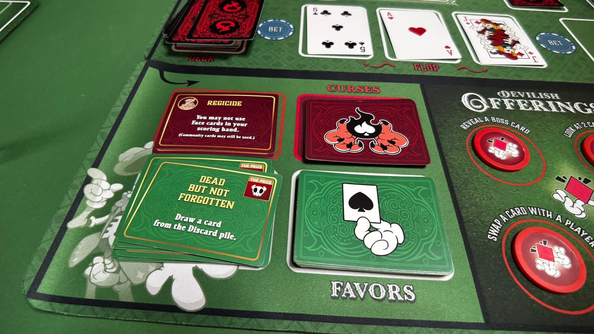 The biggest difference right from the start—players start with three pocket cards, not two, but they can only use two pocket cards in their winning hand (a rule that is notoriously difficult to remember at times, much to my table’s chagrin). There are also ways for players to gain more cards, either through the Favor deck, which provide one-time use cheats that can be played after betting, or via the Devilish Offering abilities shared by the players in a pool. There are even some bosses that have special abilities that either add to their hand or the board (community cards). The fact that there can be much more cards in play during any given hand is a huge part of what makes the game distinct from standard poker.