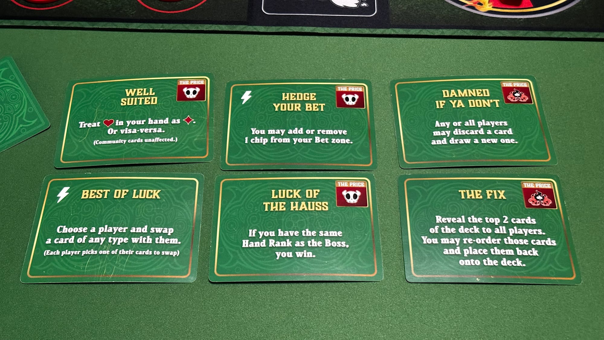 Ideally, each player is able to put together a hand that will beat the boss, who gets dealt two pocket cards with which to form their own hand. But they also have a fallback hand on the boss card (mostly three-of-a-kind or two-of-a-kind), guaranteeing the need to build a big hand to defeat them. The rule-bending and cheating mechanics make building those monster hands easier, but it’s just as easy for the boss, making it more balanced than you might think. Flushes and straights are usually killer hands, but when everyone at the table has one… The flip side of that being, it’s actually pretty ridiculous and awesome when everyone has a monster hand!