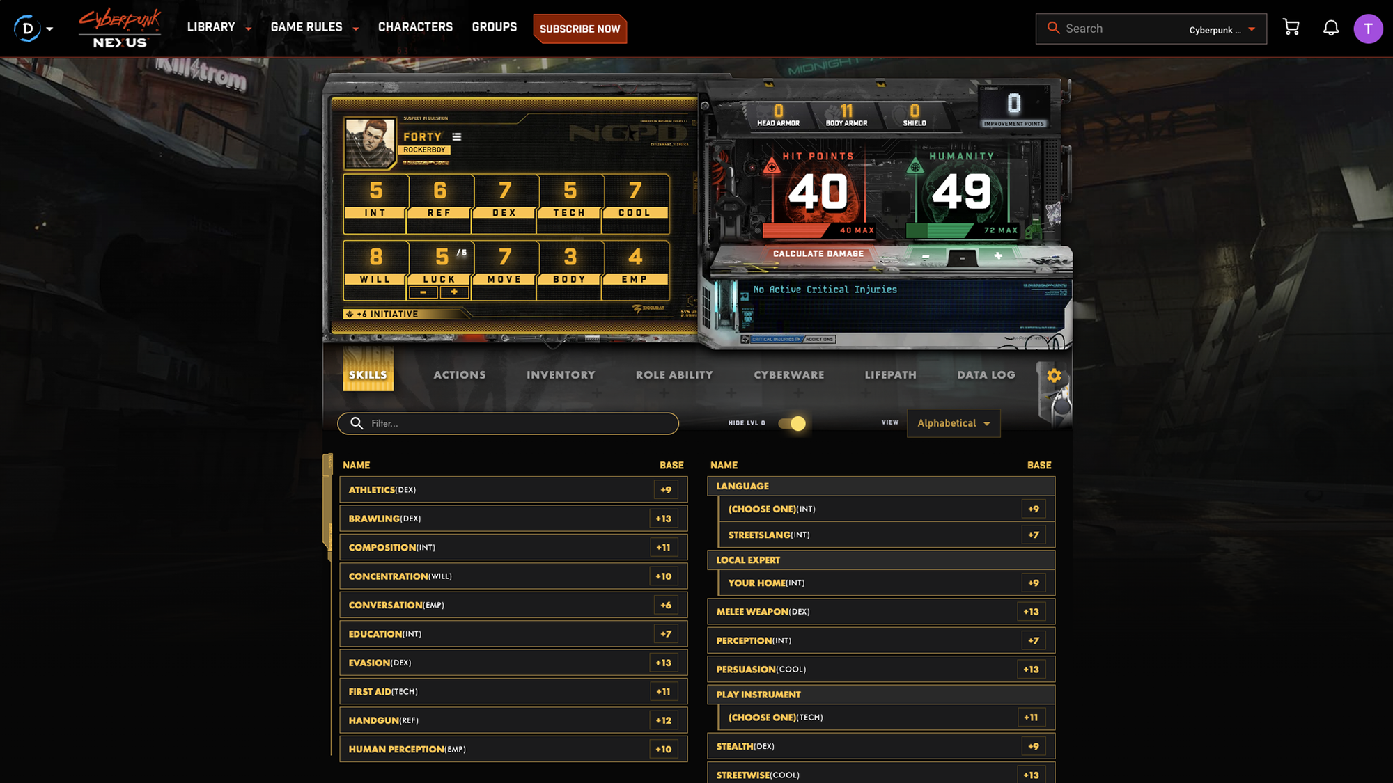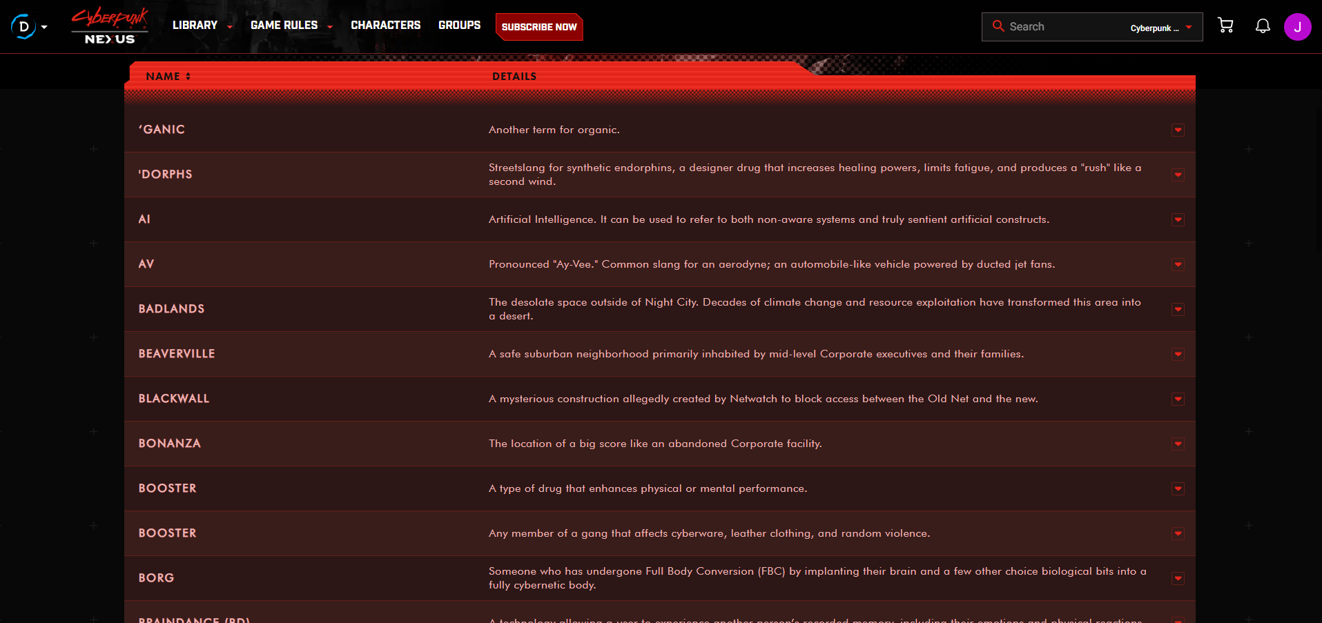That’s besides a searchable rules compendium and the ability to share with up to 24 friends (double that of D&D Beyond). It’s all clearly broken out between rules, cyberwear, items, and the like, but I count myself impressed with the Street Slang section. A comprehensive listing of setting-appropriate terms with pronunciation guides and rules reference as necessary, this will go a long way towards building out the setting. I would never imagine players sitting with a book’s glossary in front of them when it has to compete with character abilities and gear, but integrated into the app it should make for a great tool.