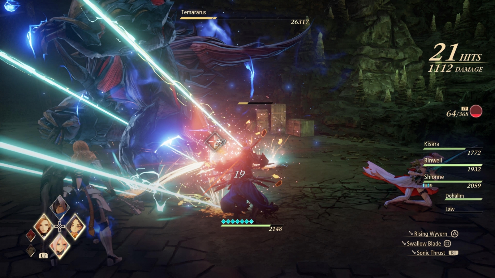 Performance is key when it comes to action games, and Tales of Arise is no exception. Combat is faster and more frenetic than ever, but that’s what makes it consistently engaging and, most importantly, fun. After running into an enemy on the field, you fight that group of monsters (called Zeugles) in a circular arena. You can perform a combo of normal attacks with the attack button (by default R1, but I swapped it with X), jump with circle, dodge with R2, and unleash moves called Artes with three other buttons. Attacking normally keeps your combo going at no cost, while Artes use up your Artes Gauge (AG) represented by blue diamonds just above your health bar. You can’t attack infinitely (for now) so you need to mix both artes and normal attacks to deal as much damage as you can in a combo.