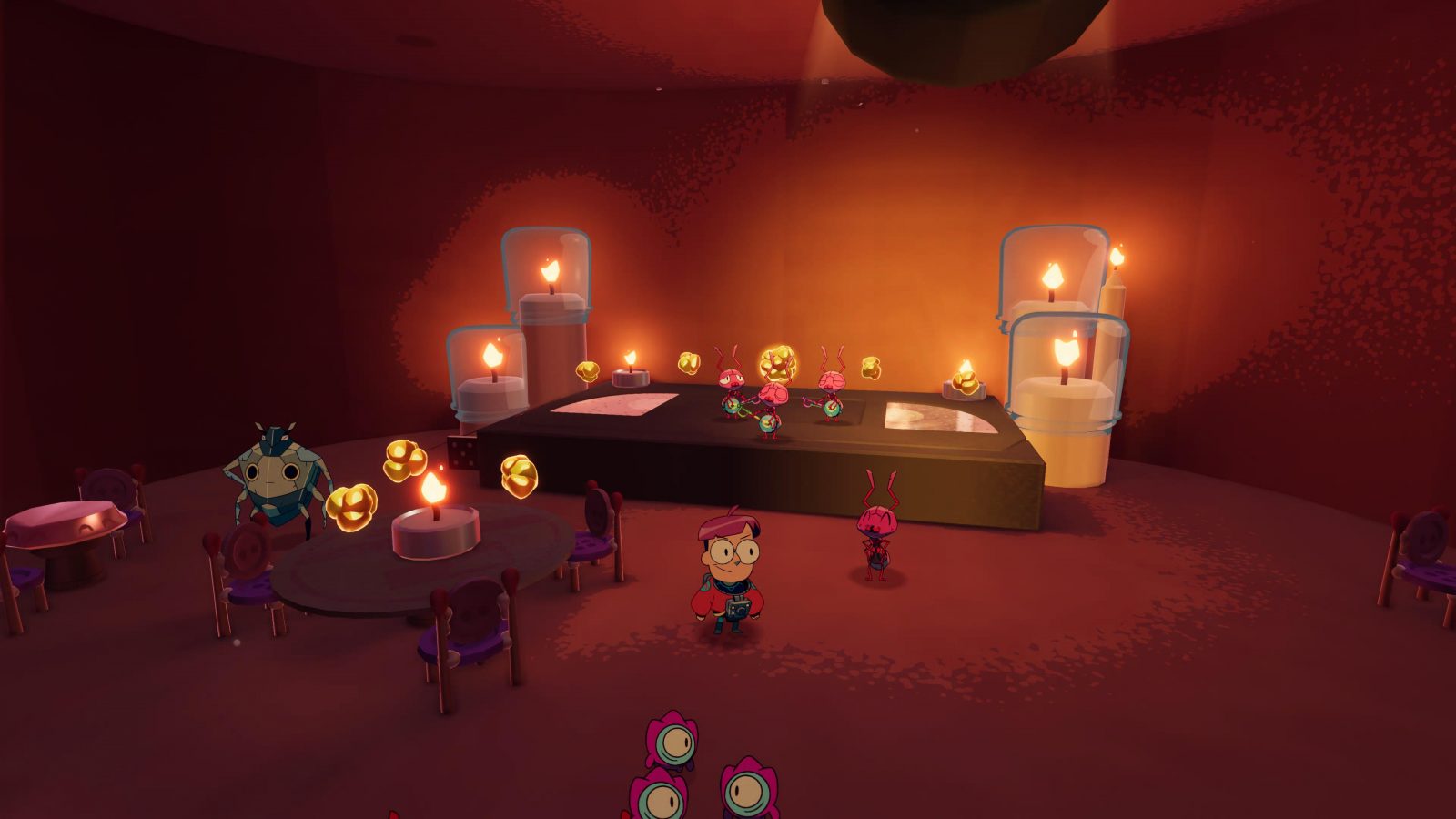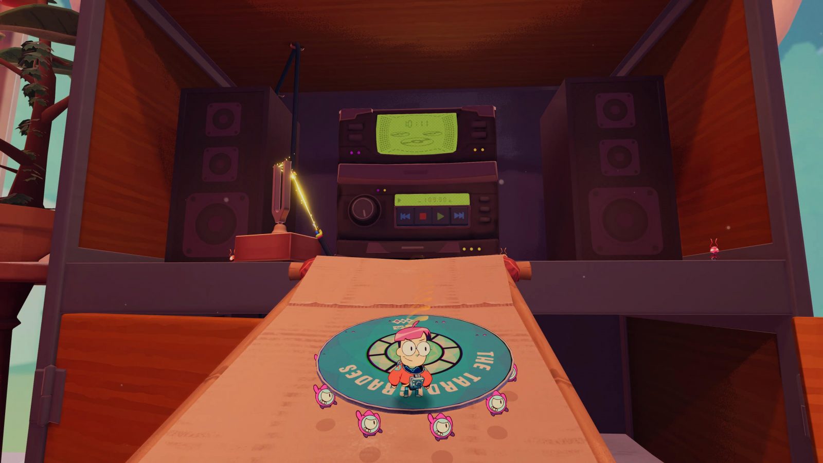 Each level takes place within a new room of the house and unfolds the story of the sprawling bug civilization. These are more than typical household environments, they are finely detailed and intricate cities built by bugs. Music venues set up within a guitar, covert rendezvous within cupboards, leafy lean-tos beside tea-candle fires, it was all so fitting for a micro metropolis. The insect denizens within the house are interesting as well, and serve to provide history and insight into the deeper story of the game on top of some comedic conversations. The main goal within each of these levels is to collect a component required to repair a device that Milo hopes to use to return home, and acquiring each piece involves helping out the locals in some way. This can be gathering items, setting up a rave in a bathtub, or even baking a giant cake. Tinykin takes full advantage of the whimsical nature of being a tiny human in a giant house, and I always looked forward to what I might get into next.