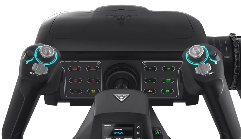 There are a great many options to show on the screen on the front of the control system, and one of my favorite functions is the “Learning” mode. Rather than having to keep your flight sheet of all your buttons hanging up near your PC, the on-screen display shows you what the button you just pressed does, as well as any range for things like throttle or yoke. Until you get the hang of the controls, this is extraordinarily helpful. Beyond this, you can also change the colors of the display. Turtle Beach could have easily gone with a single LED color and called it good, but depending on your lighting (or in my case, having had Lasik — I struggle with blue LED lighting), the ability to adjust it is a godsend.