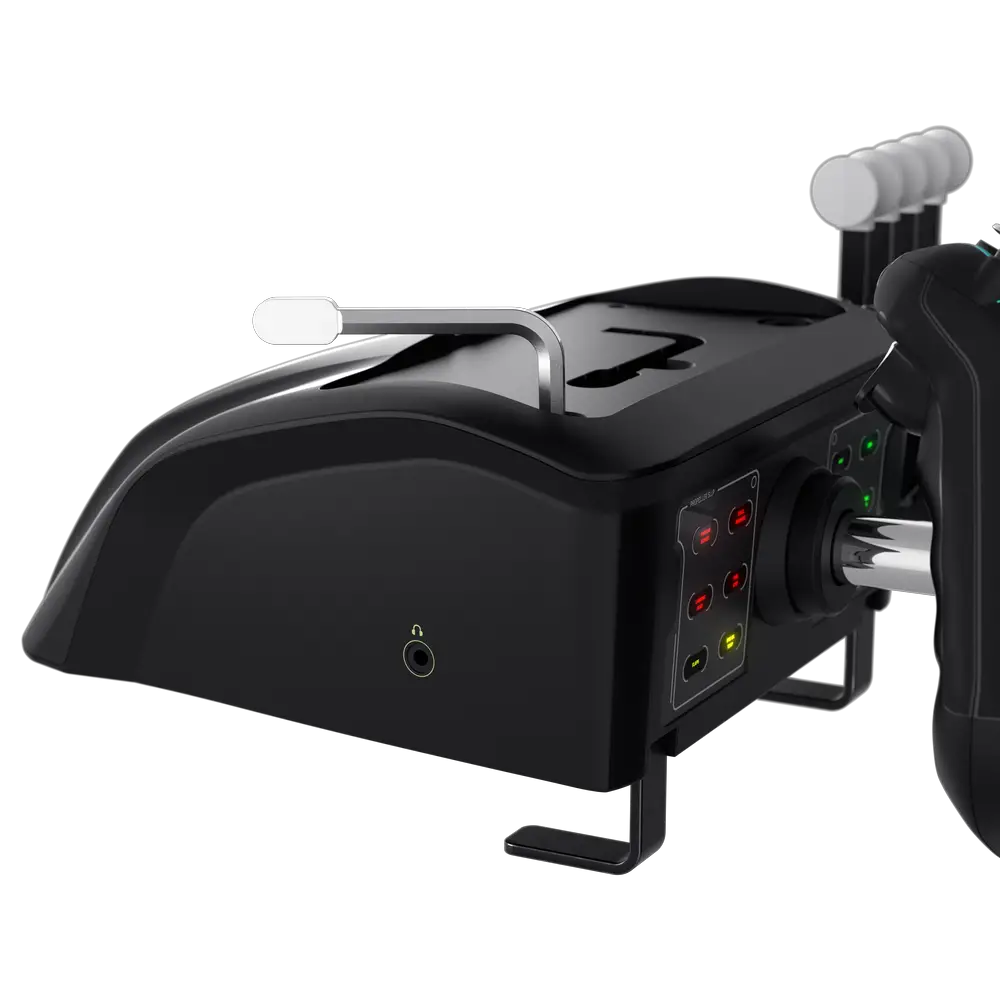 Underneath the device lies two metal arms. Underneath a panel on top lies a bespoke allen key you’ll use to lower these metal arms so you can lock them onto just about any desk. Rather than a massive clamp that sticks down, these little feet are just U-shaped feet that, when combined with the rubber feet underneath, ensure that the device will not move at all. It’s a slick solution that is miles ahead of other flight sticks I have — a sign of things to come when it comes to the overall engineering of the VelocityOne. With the device locked down and stable it’s time to fly.