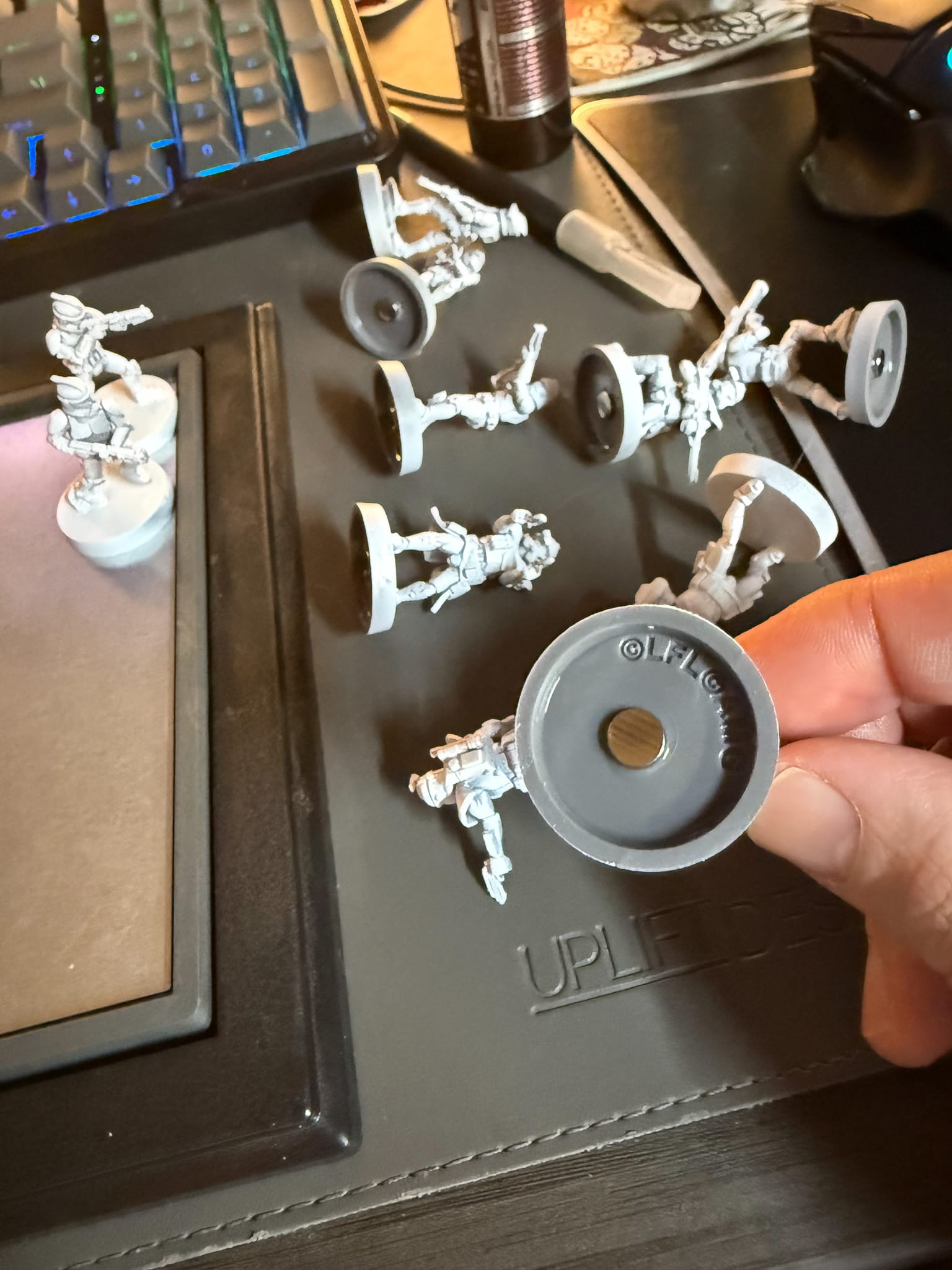 My second step was to do something I've never done before: magnets! How do they work? Easy. I used superglue and D6x1mm magnets. I found that they are a great size for the Legion bases, and when I glued one, a second one attached perfectly and made for a perfect fit in my carrying case, a Tablewar case.
