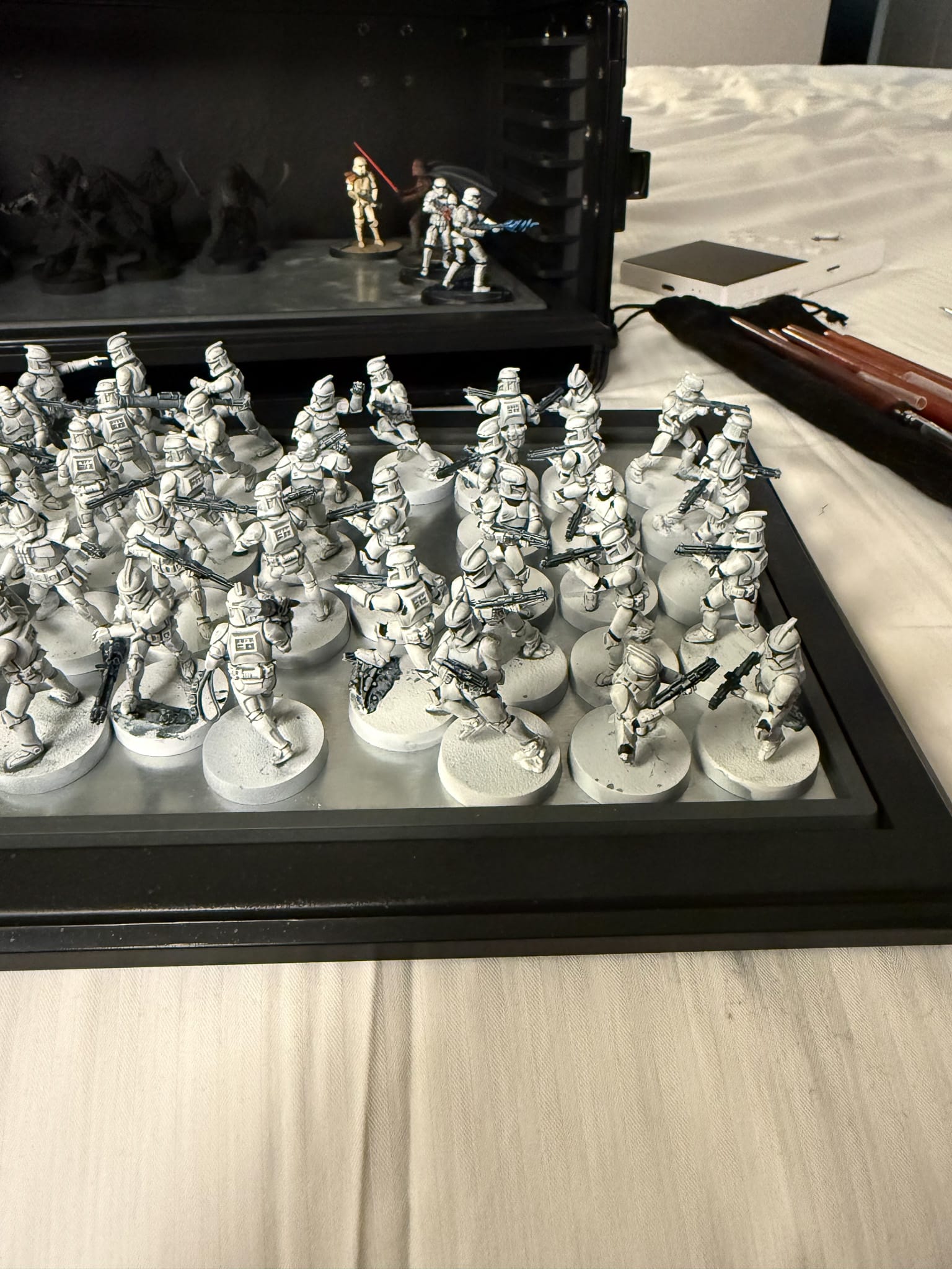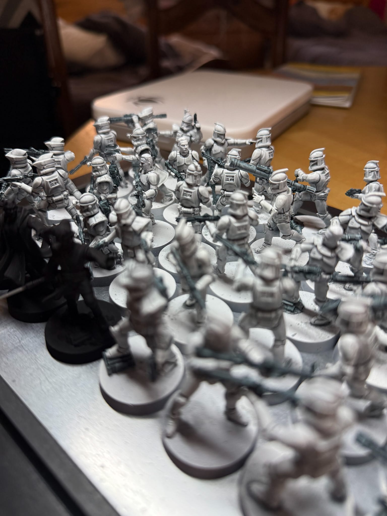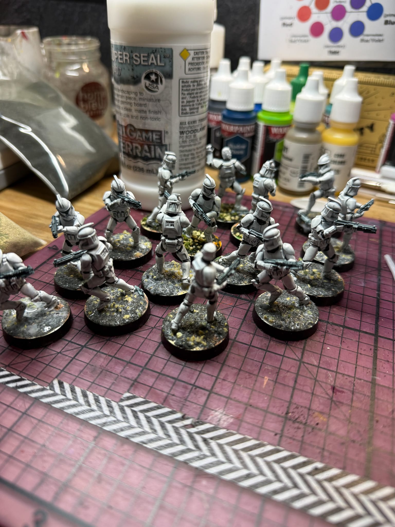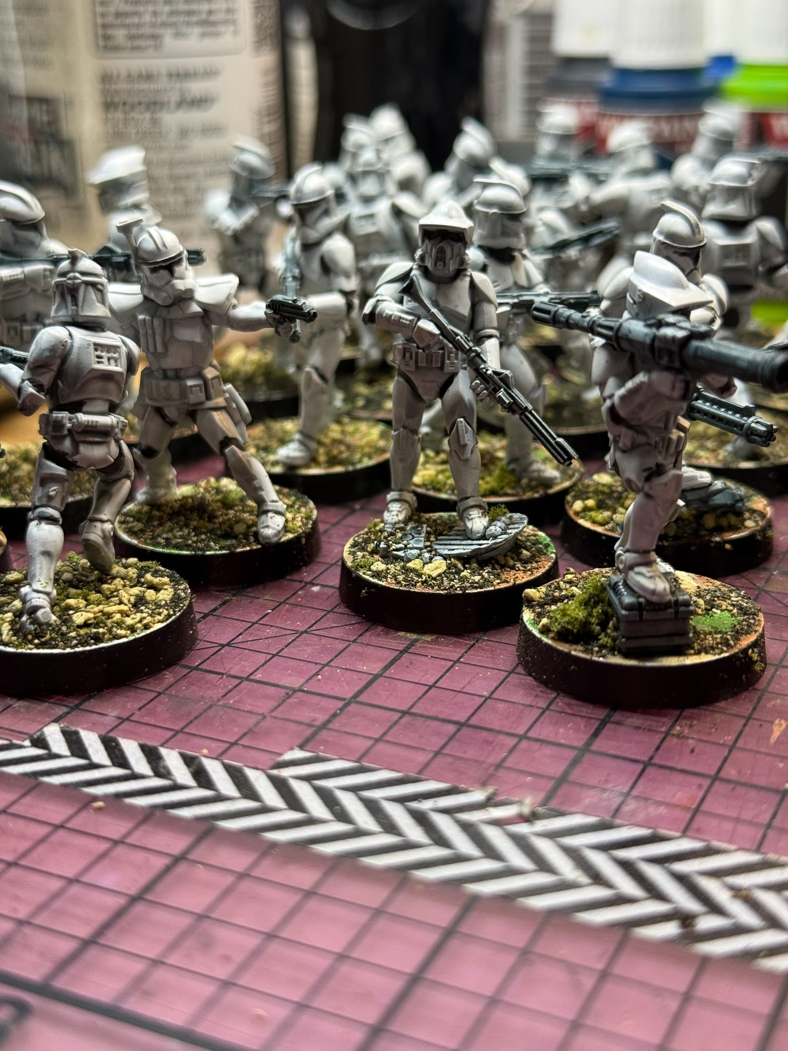 First, a prime. White Scar is the can I have sitting around, but any white or off-white primer will do. Blast your clone from all directions, making sure that the white covers the model in its entirety. Then, I used AK Quick Gen's White Shadow, which is a contrast/speedpaint. If you're not experienced with these, they're a product that has come out in the last few years which allows painters to lay on paint, typically over a white or zenithal prime, and see instant results. The nature of the paint allows it to flow into cracks and fill in details, generally saving you time in creating shadows. I will also now admit that I didn't take too many in progress shots, so here's some shots from when I worked on the entire army.