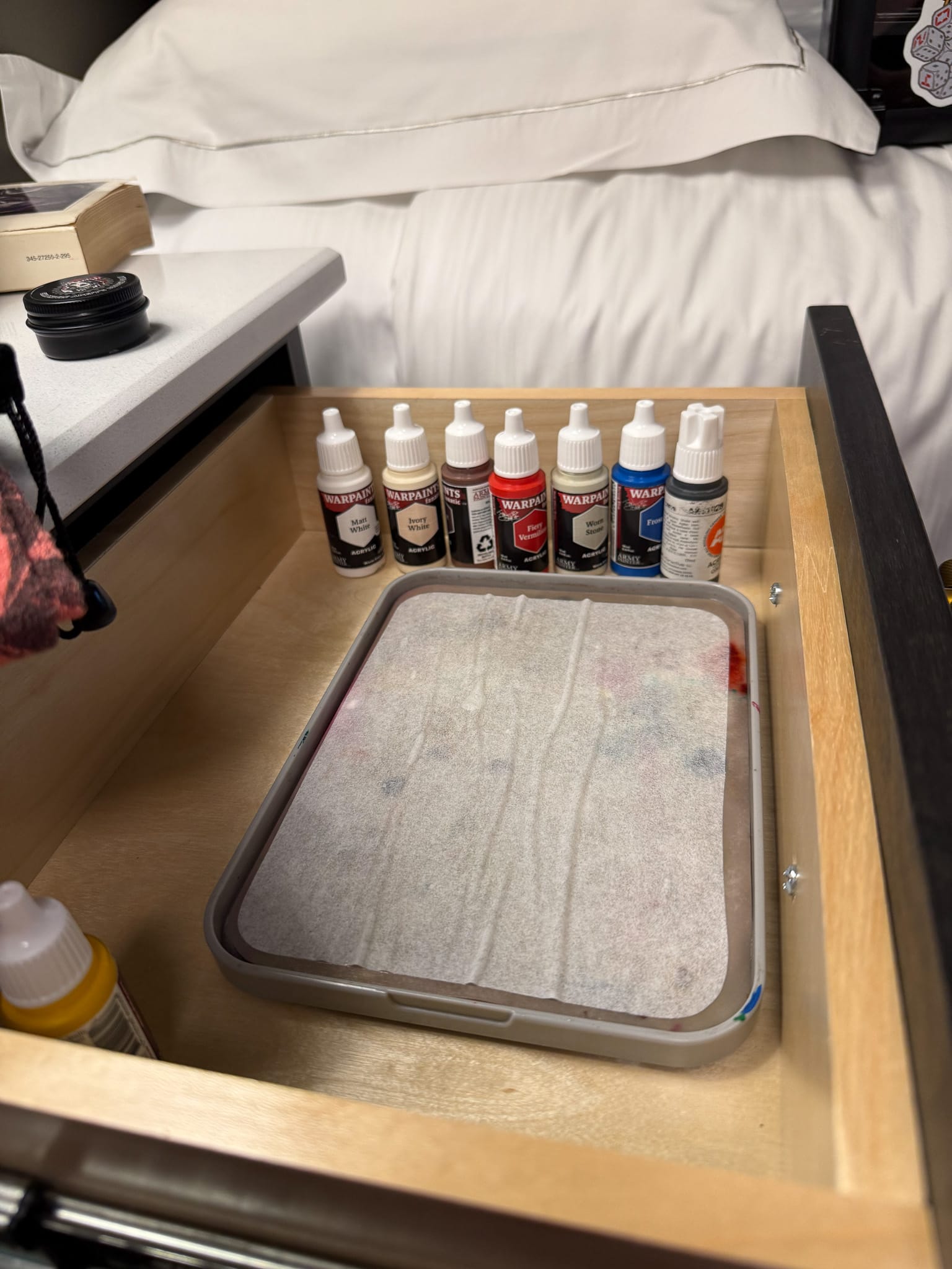 Yes, a hotel side table can hold a wet palette and selection of paints.