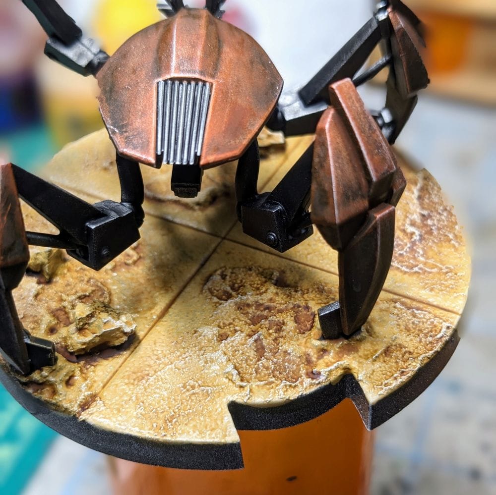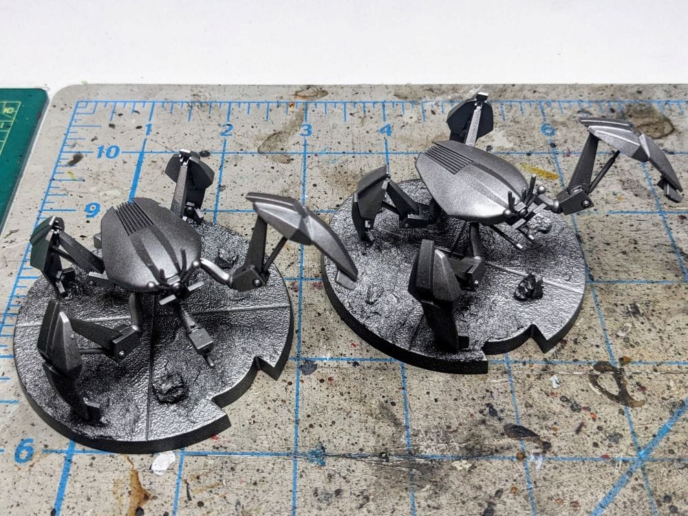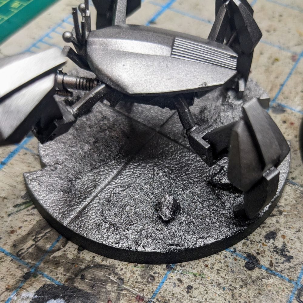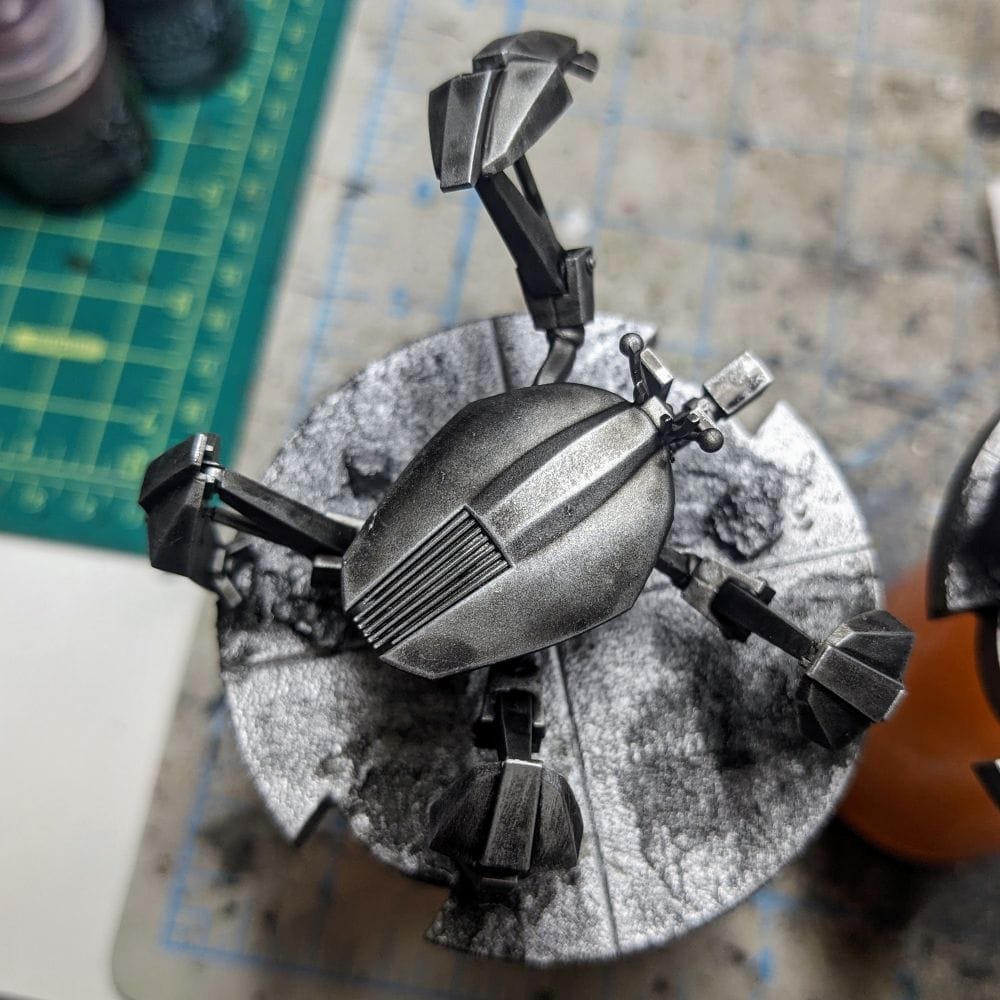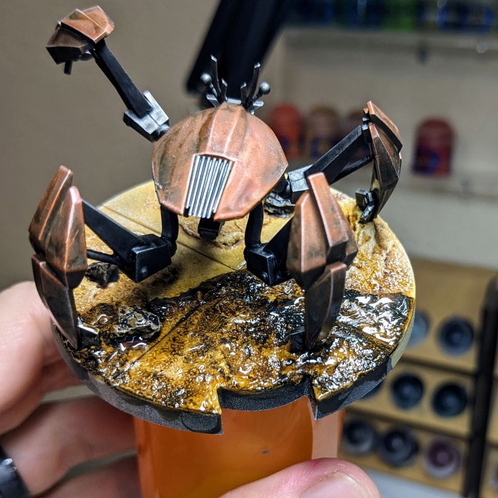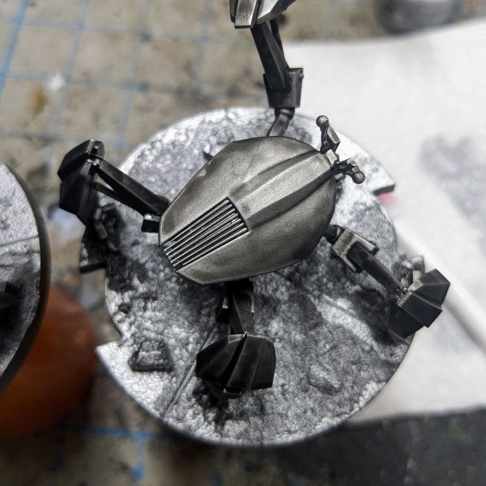 In general terms, getting the majority of a color for a model applied via a rattle can or airbrush saves a lot of time. Since these droids are primarily metal, I wanted to use that to my advantage for painting. To start, I applied a zenithal prime on the model, with a bottom coat of Rustoleum Flat Black and top-down coat of the Army Painter Plate Mail Metal spray. You can see now that the rocks and texture paint is all one color, which we will come back to later.