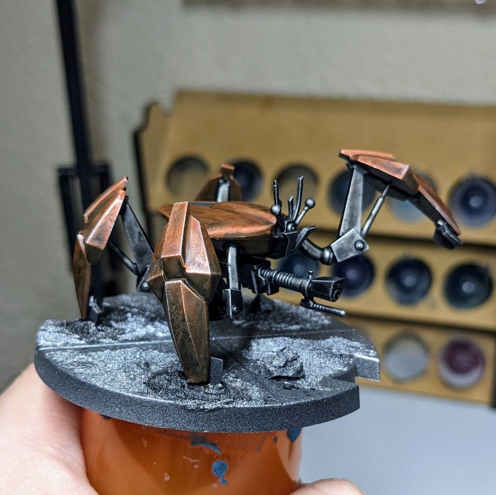 Once I was satisfied with the metal tones, I applied the Gryph-Hound Orange to the “shell” parts of the piece; the head/body and the upper and lower wider parts of the leg. I made sure to cover the inside of the leg, even though it’s going to be very dark by comparison and won’t show as much of the orange. When applying the contrast, I made sure to start the brush at the topmost part of the model and then draw the brush down the model. This helps prevent the paint from pooling up at the top, creates darker tones at the bottom, and helps get a more even coat of paint throughout the whole model.