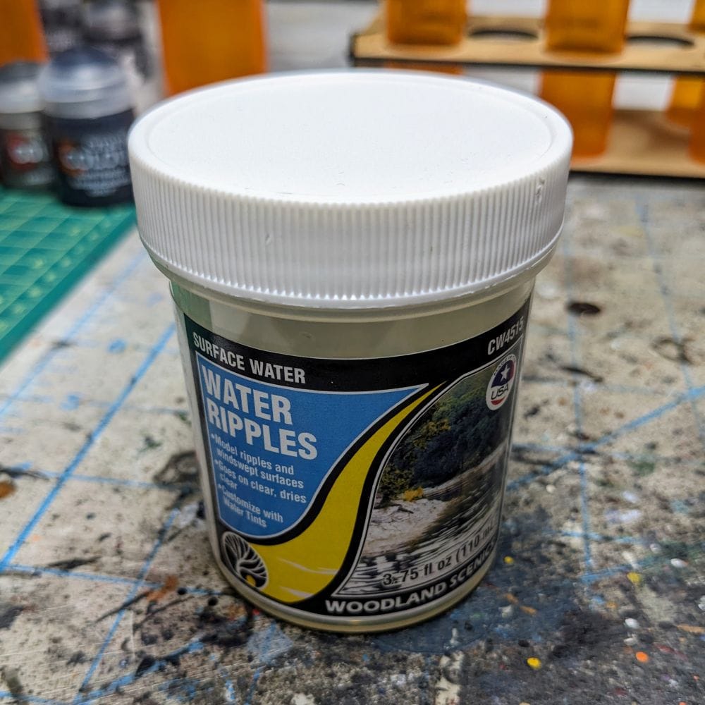 With a thicker brush, I applied an uneven, medium-to-thick coating of Woodland Scenics Surface Water - Water Ripples on the darkened area to try and give it the effect of movement of water either coming or going. After this dried, I applied a second layer of water effects to the most raised areas of the water to try and give a little more height to them. I also applied this technique around the legs and rocks, where water would normally be rippling around. On the legs, I used some gloss varnish near the ends of the legs to show that it’s still wet, but that this metal best is drying off in the sun.