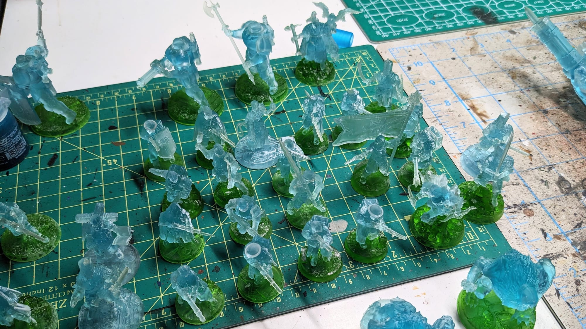 For printing, I use water-washable resin, which allows me to clean them in a sonic cleaner using the degreaser Simple Green. Sonic cleaners don’t do well with flammable solvents, like acetone, as they can catch on fire and/or explode. I’m not being flippant here - seriously, be mindful of what chemicals you use where. Anyway, a degreaser in a sonic cleaner really helps to shake loose the remaining resin, especially for the hollowed-out minis. Once that’s done, I give them a quick water rinse in a 5 gallon bucket of water, peel off the basing, and let them cure. The temperature from the sonic cleaner allows me to easily remove the small supports from the minis without running the risk of breaking the model itself. If there is a sword or rifle I’m worried about accidentally removing along with the supports, I just clip those.