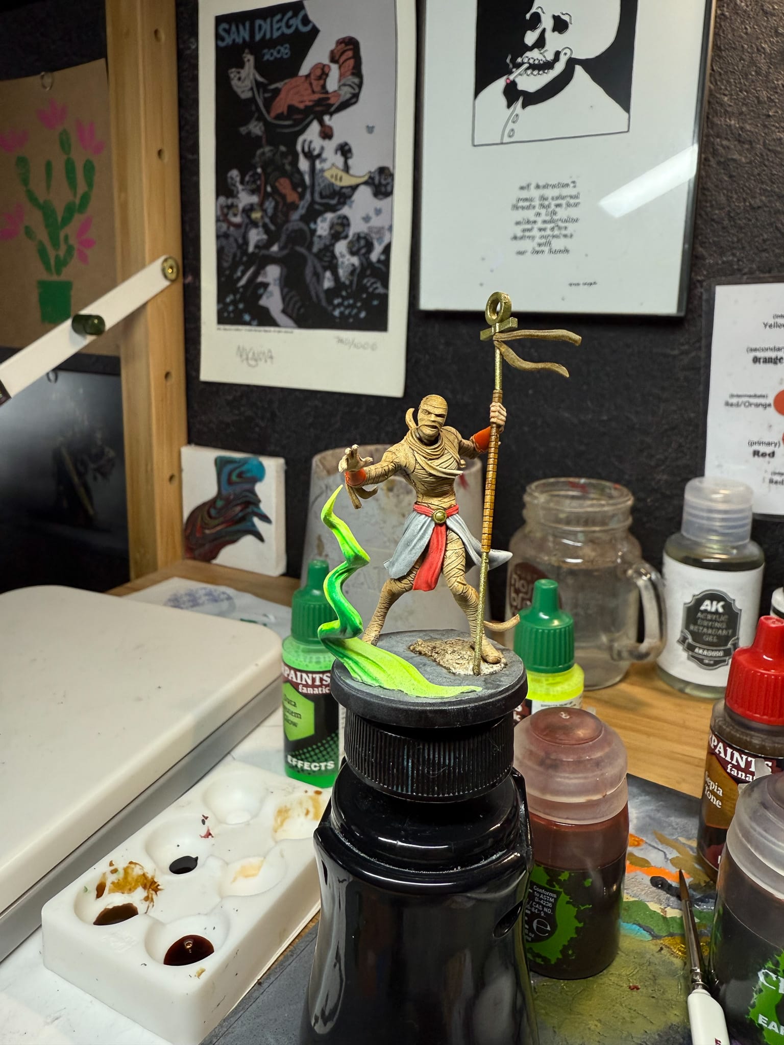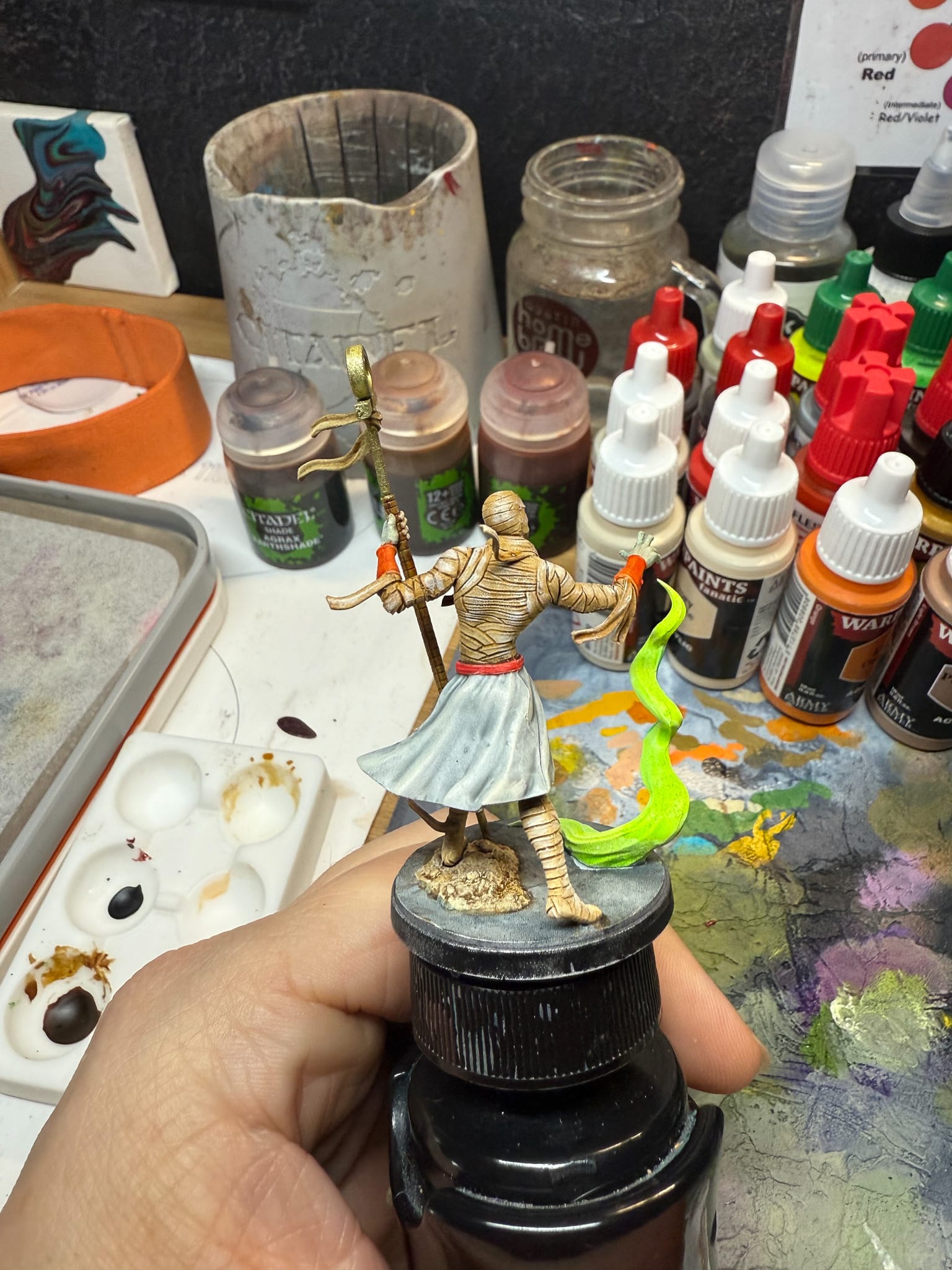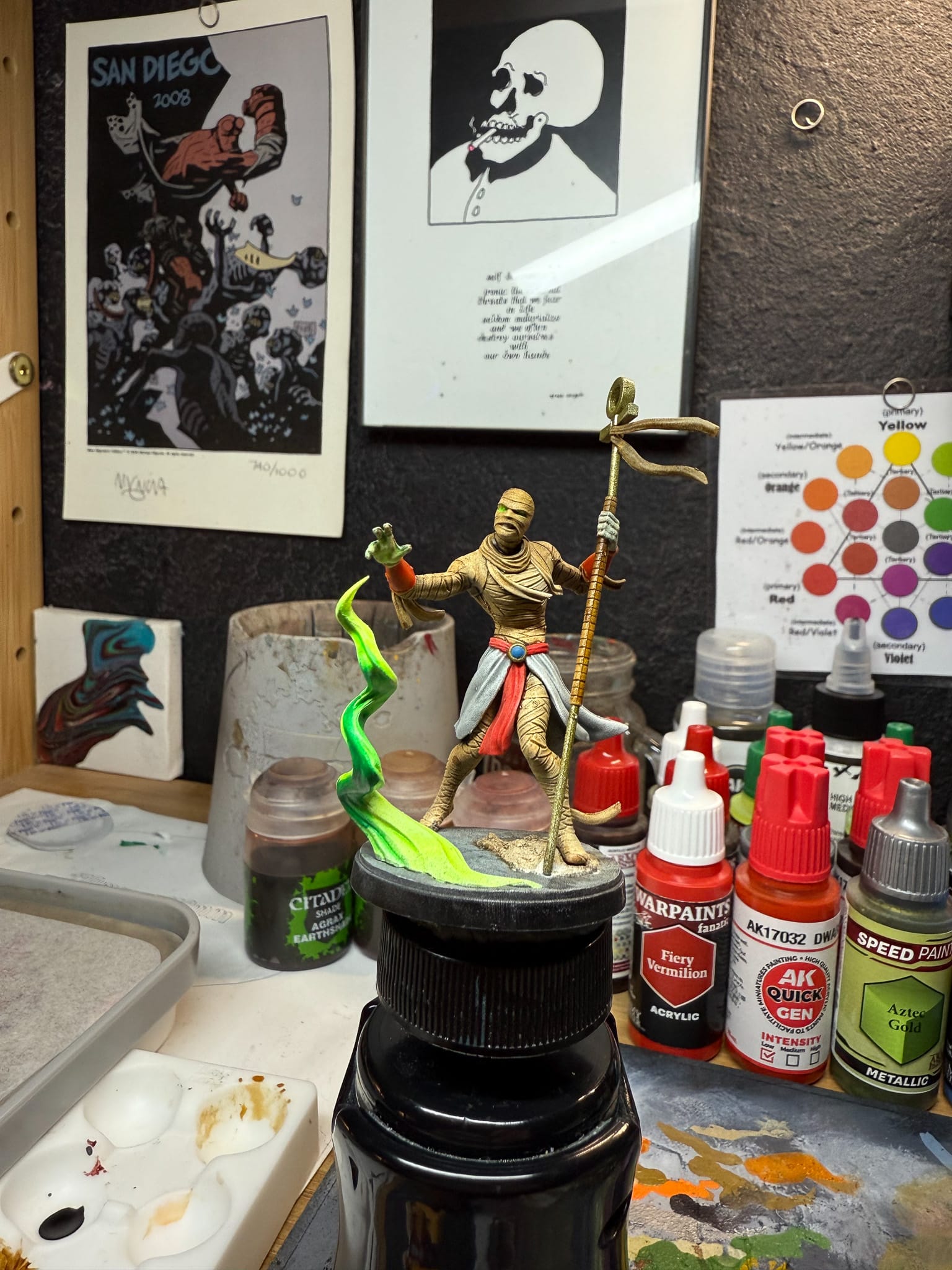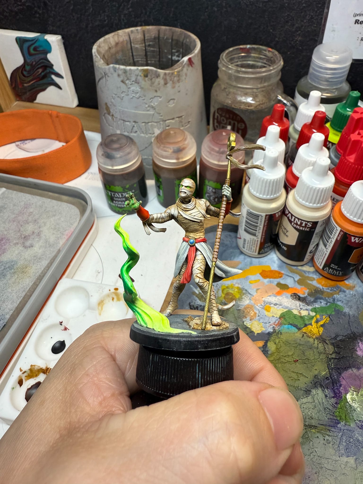 This model comes with a really cool magic effect, and I wanted to make this the centerpoint of my painting, so I used fluorescent paints. Data System (AP) and Lens Flare (AP) are great water paints, with a nearly inky consistency, making them great for wet blending. I painted the lower parts more green, and the higher parts more yellow. I also took the same mixture and applied it to the Mummy’s hand. However, a challenge occurred because this paint doesn’t stick so well to flat surfaces, so I mixed some Golden So Flat Acrylic Green to the mix for certain areas. This is more of an artist grade paint and it mixed perfectly well with my wet blending. Then, a dry brush stippling method using Warped Yellow (AP) and Leafy Green (AP) helped create the glow surrounding the magic. On the backside of the magic, I used a little bit of Plasma Coil (AP), another fluor from Army Painter.