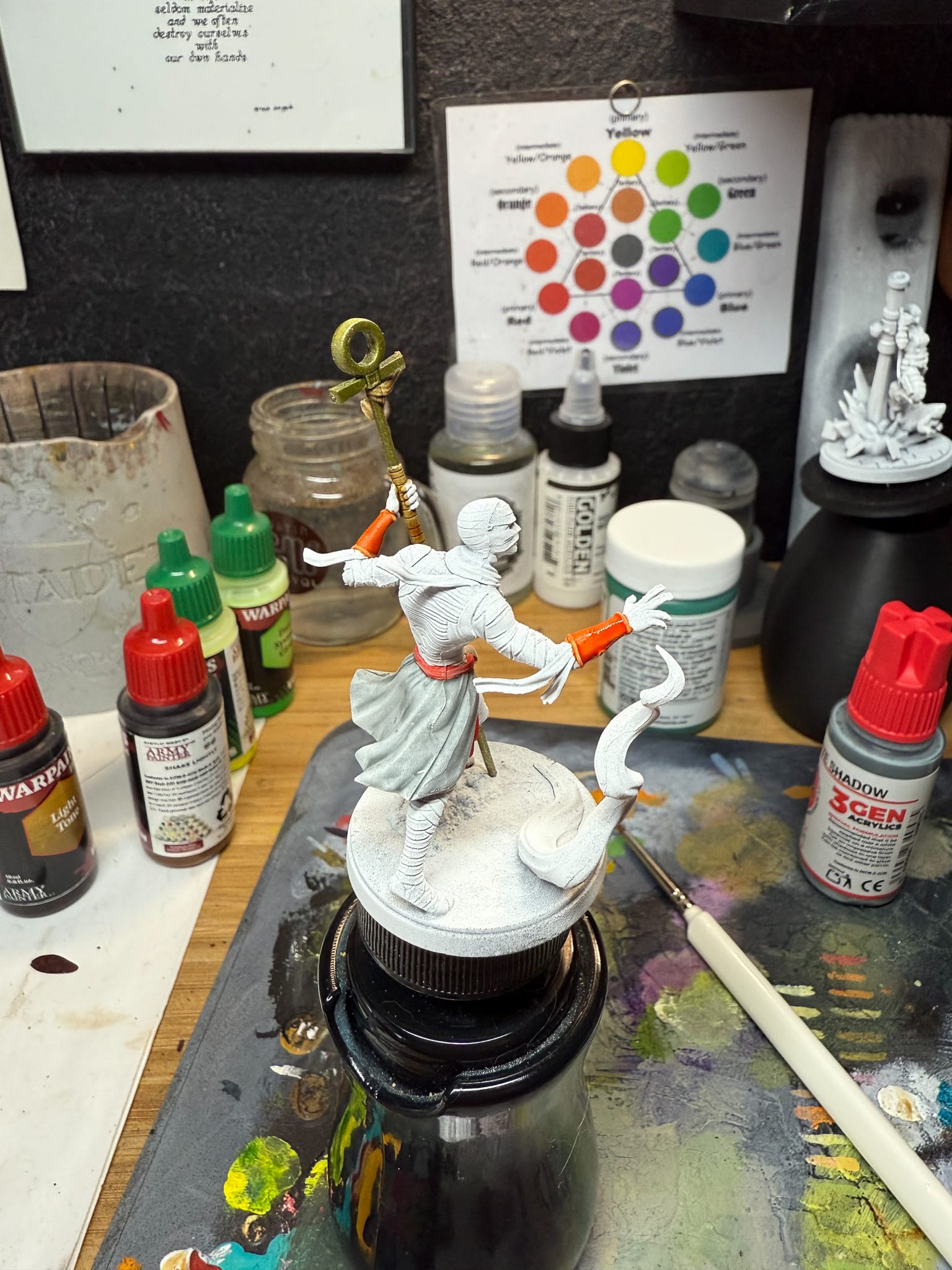 When working on models such as mummies, skeletons, ghosts or other subject matter that features pale tones on the table, priming with white can be a quick hack. I recommend this if you’re looking to get a model out on the table quickly, or if you’re new to painting these kinds of pieces. The reason being is that by starting with a pale tone, you can add shadow to it for a quick and nice finish.If you want to go for a richer tone, then prime in a brown or darker blue and work up to your whites from there. It’ll give you more options for tones, and less cleanup work later on. For this review, I went with White Scar (GW) as my primer.