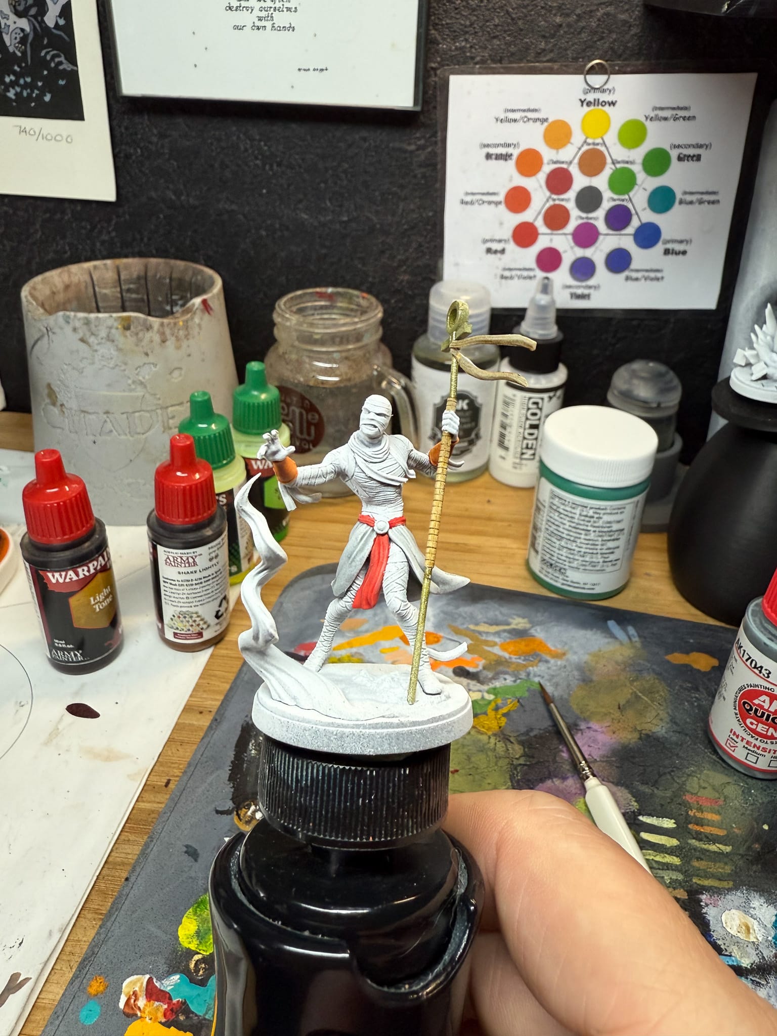 The red belt was Firey Vermillion (AP) from the most recent Army Painter John Blanche line. I really love this red, it’s bold and highly pigmented. Outside of the reds from Golden paints, I can’t think of a better paint. Two thin coats is all you need.