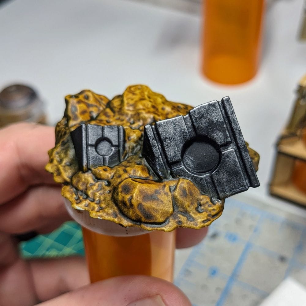 Lastly, I painted up the debris bits. Since these were unevenly primed, I blocked out the colors of each element in the debris: Abaddon Black for the Boxes and Mechanicus Standard Grey for the buried metal piece. I drybrushed a little Necron Compound on the door before using Nuln Oil to heavily paint the submerged metal.