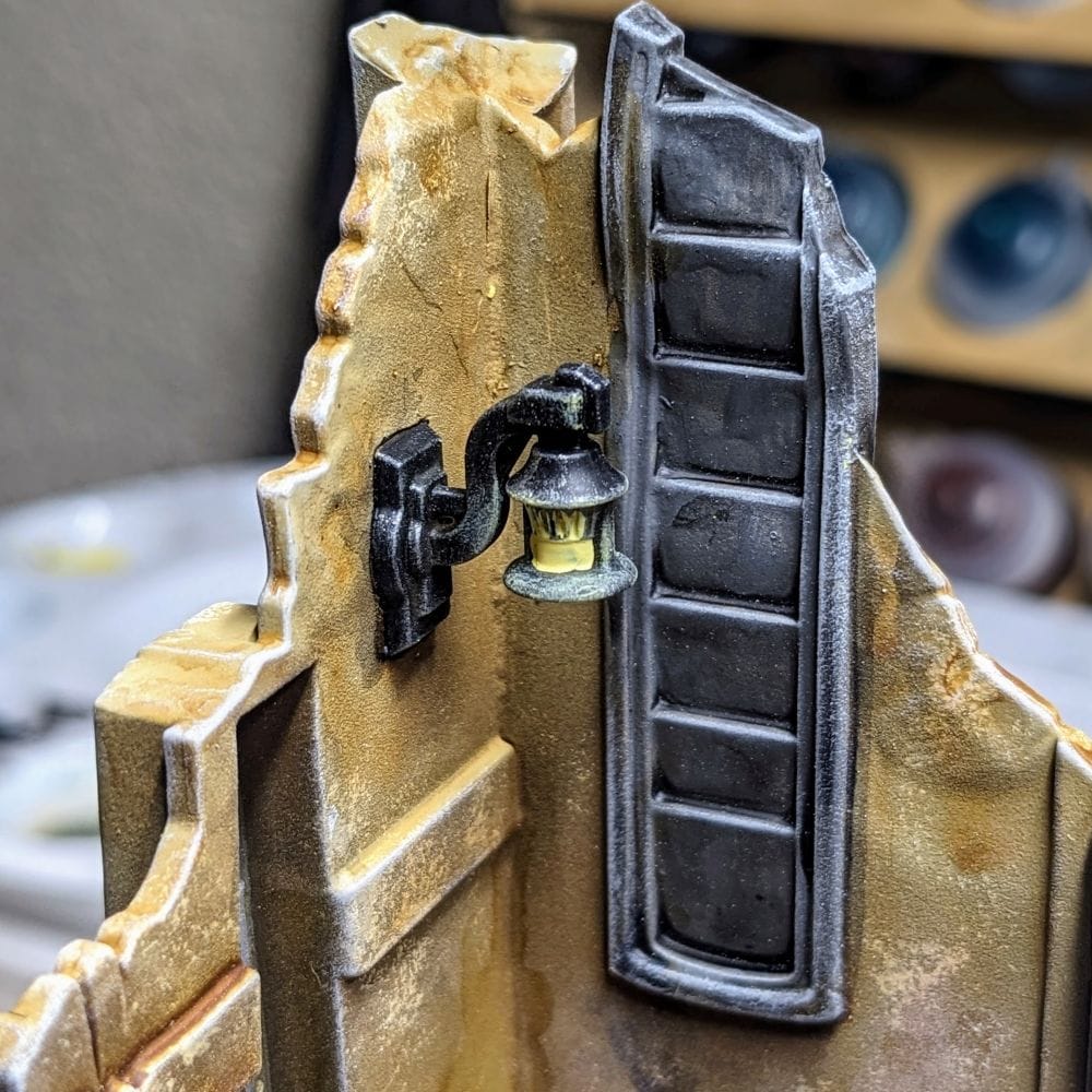 Like the power poles, I applied the Orange Glow OSL to the lantern in the corner, giving the impression that there is still a little power left in this demolished corner.