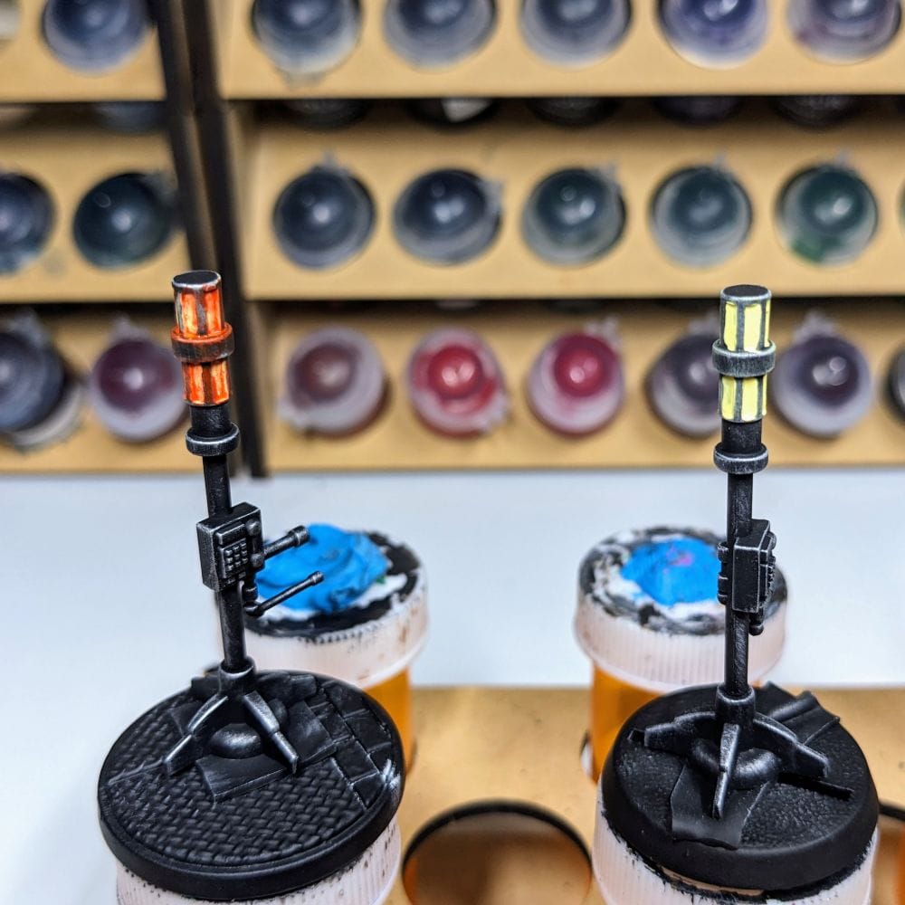 To show that these poles are still active, I wanted to show the lights at the top being on using a technique called object source lighting. I lightly drybrushed Hexos Palesun around where the light would be coming from. Then, I applied some uneven, thin coats of Dorn Yellow to the part of the pole that has the glass on it. I used some thinned-down Magmadroth Flame over the yellow and wiped some of it away (using a brush) from the center to help bring out the yellow. I intentionally let the Magmadroth get onto the metal parts with Hexos Palesun to help create an orange glow from the light, leaving the brightest part of the light at the center of the lights.