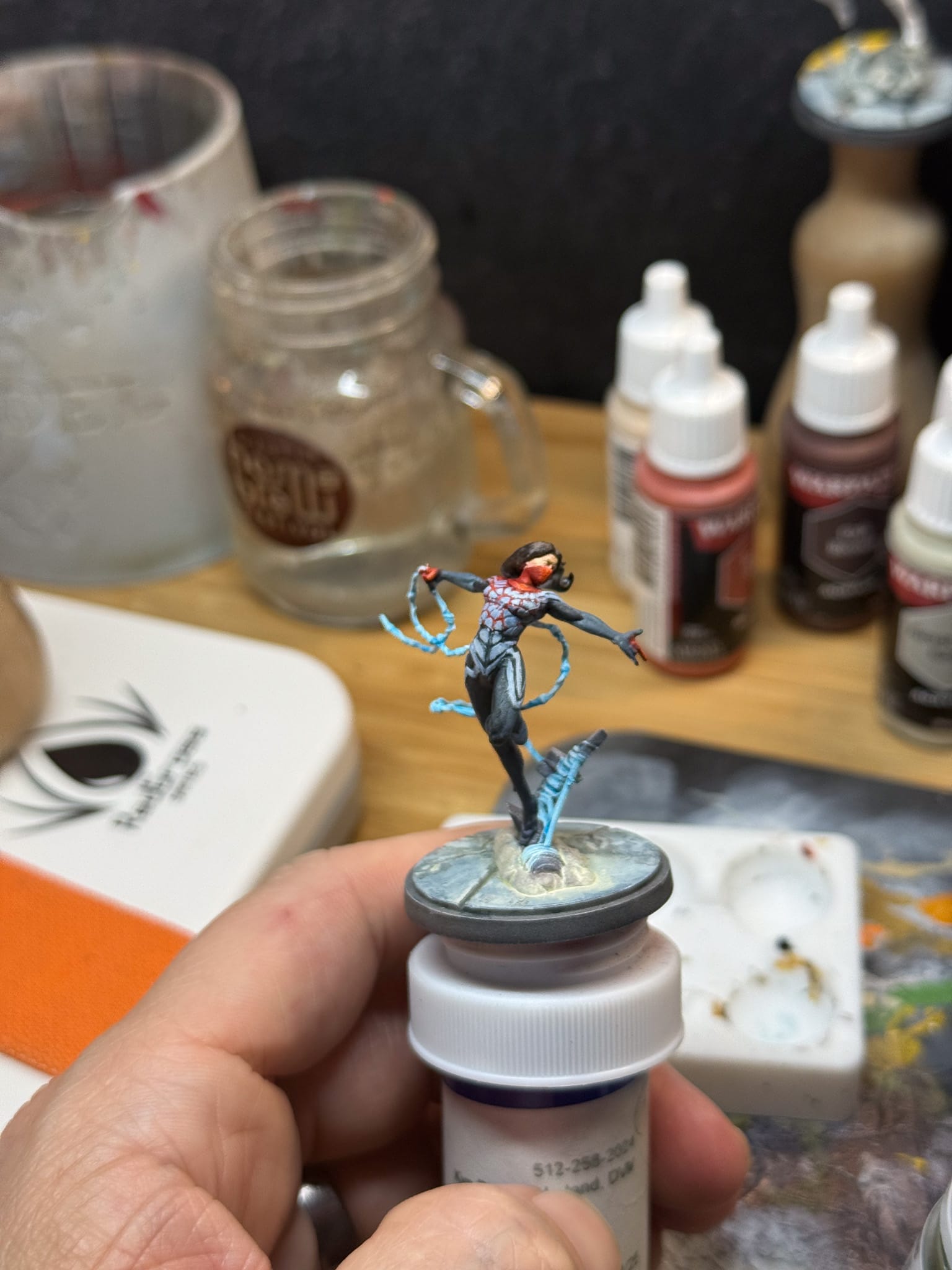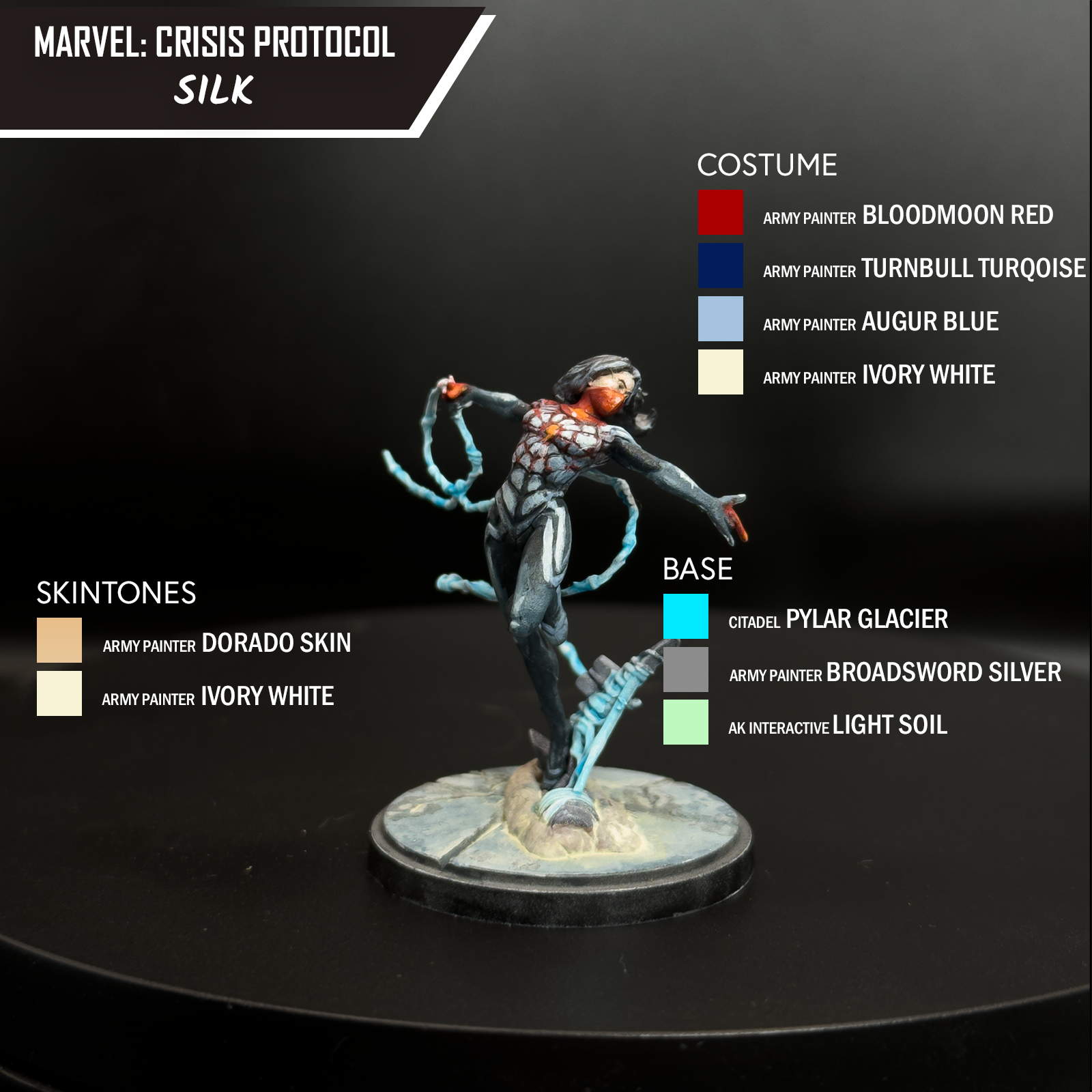 Back to Silk, Citadel Pylar Glacier on the webs, and AP Broadsword Silver on the metallic part of the base. For the white parts of her suit, I used Augur Blue with a small brush and painted each individual part of the webbing. This was the most time I spent on the model, and the most frustrating, but to make it work correctly, I had to do that.