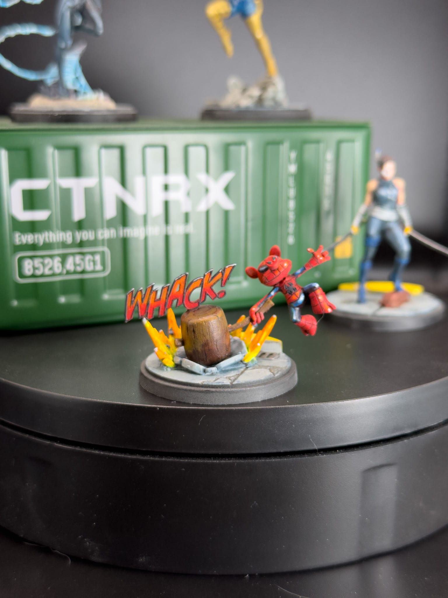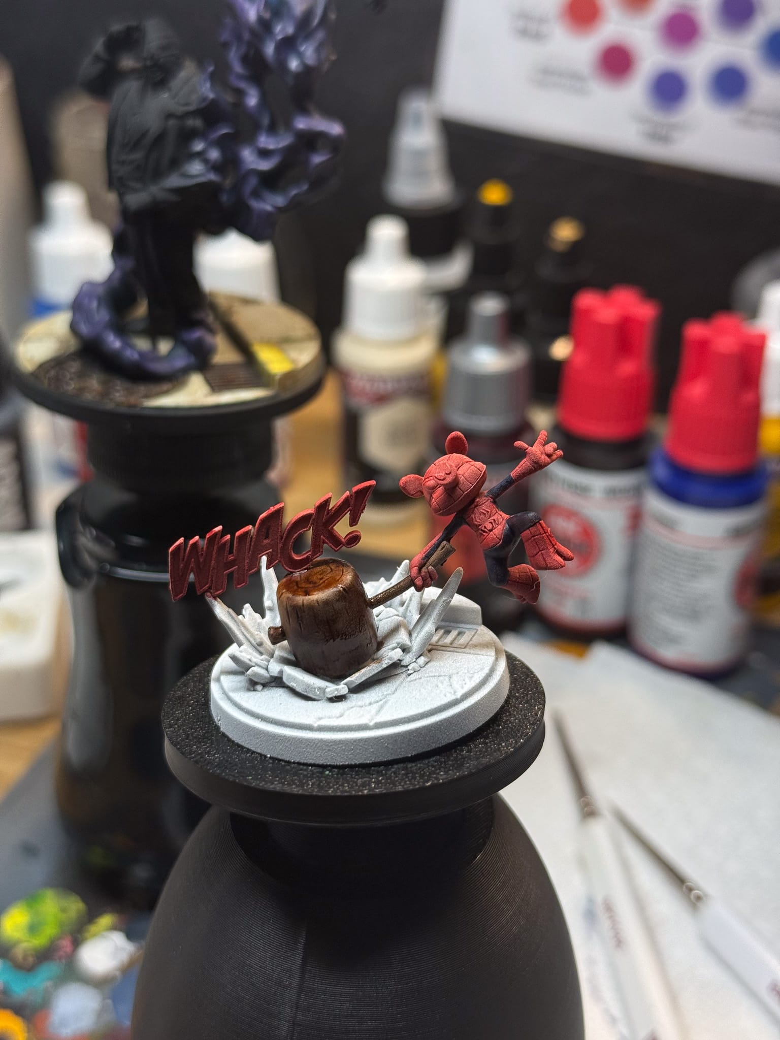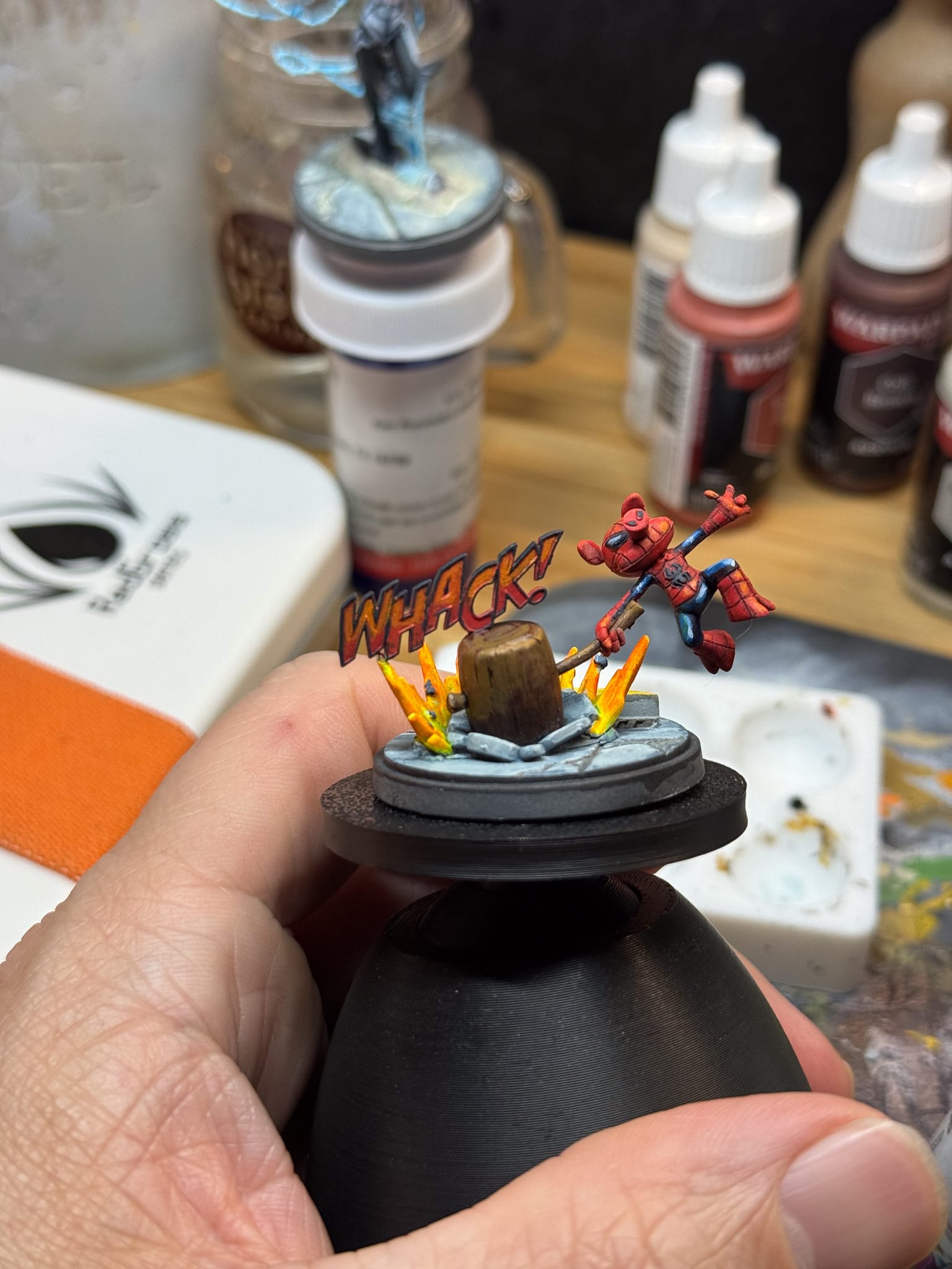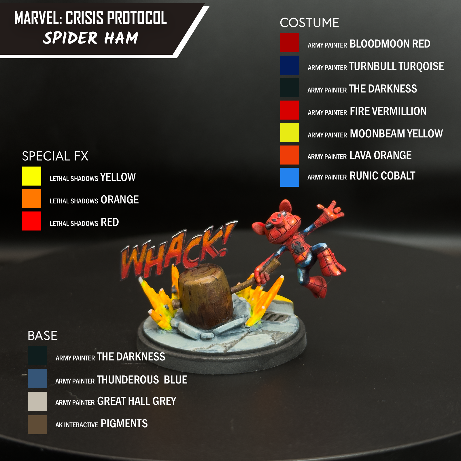 For the star of the show on Spider-Ham, both the cartoon explosion and “WHACK!”, I focused on using fluorescents. Yellow, Orange, and Red from Lethal Shadows have a thicker mix to them, which allowed me to blend and thin down to various consistencies. Sorastro, a very good Marvel Crisis Protocol painter, has an excellent process for explosions. I highly recommend checking out their tutorials for that.