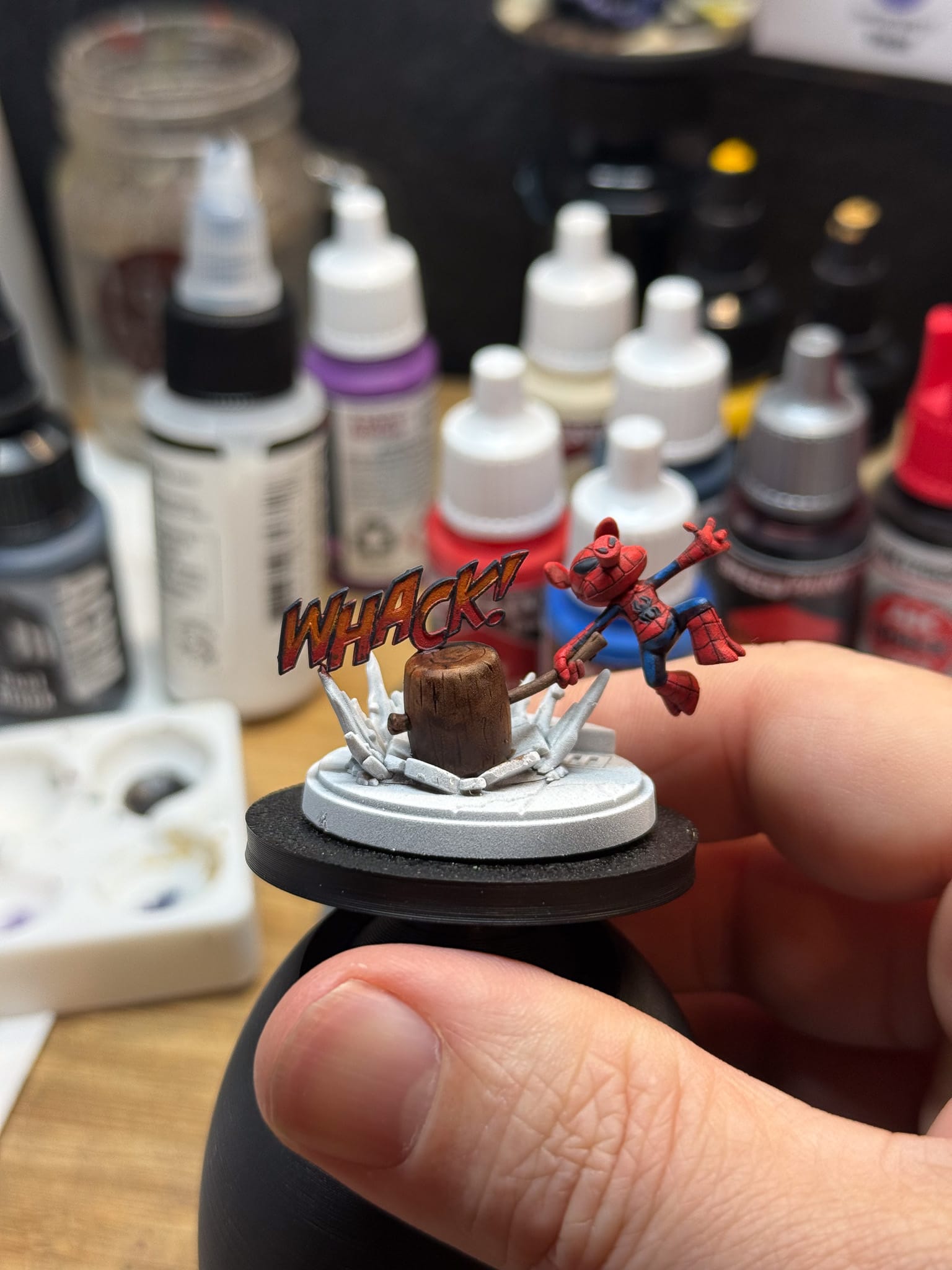 On Spider-Ham, I used the same colors along with the AK Quick Gen Wood to make quick work on the hammer.