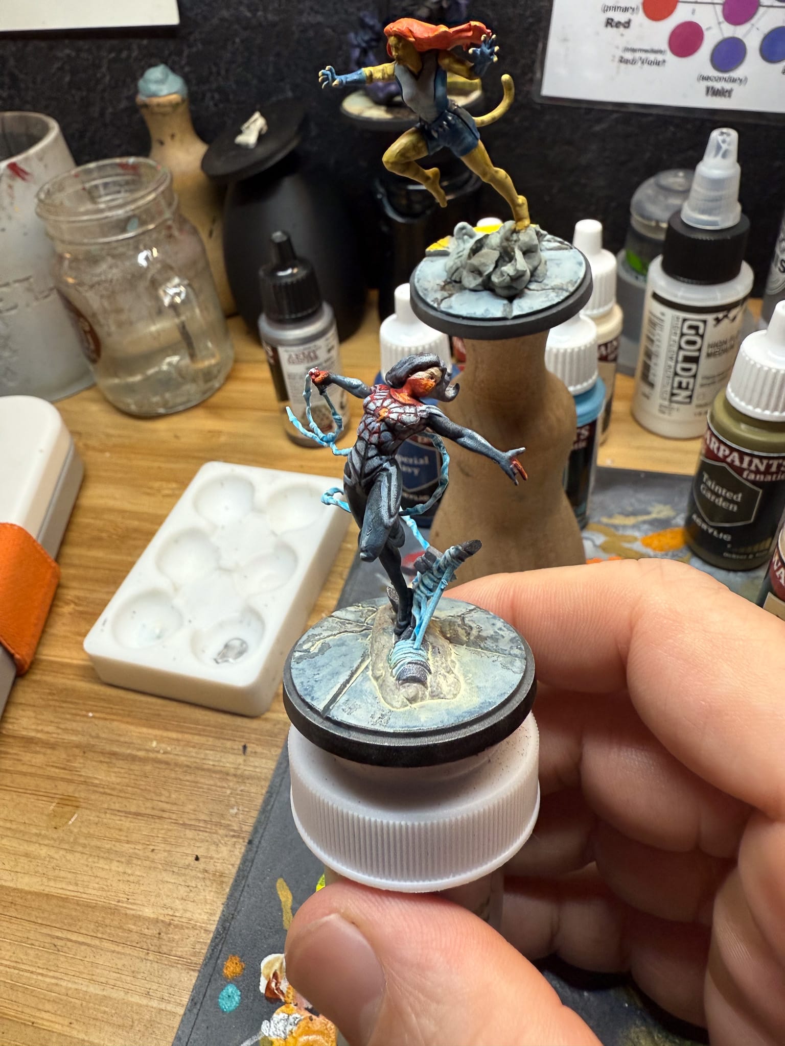 Getting into the mid-tones for both models was a bit more fun. On Spider-Ham, I focused on keeping it simple. The blue tones contained The Darkness working it’s way up to Royal Blue, which is a solid blue tone. This mix gave me good shadow coverage and an almost comic-like feel for the blues of the costume. Using a stippling technique, I was able to create some nice transitions vs. straight lines. For the reds in his costume, I used Fiery Vermillion and added a small part of Moonbeam Yellow and Lava Orange to build up those tones.