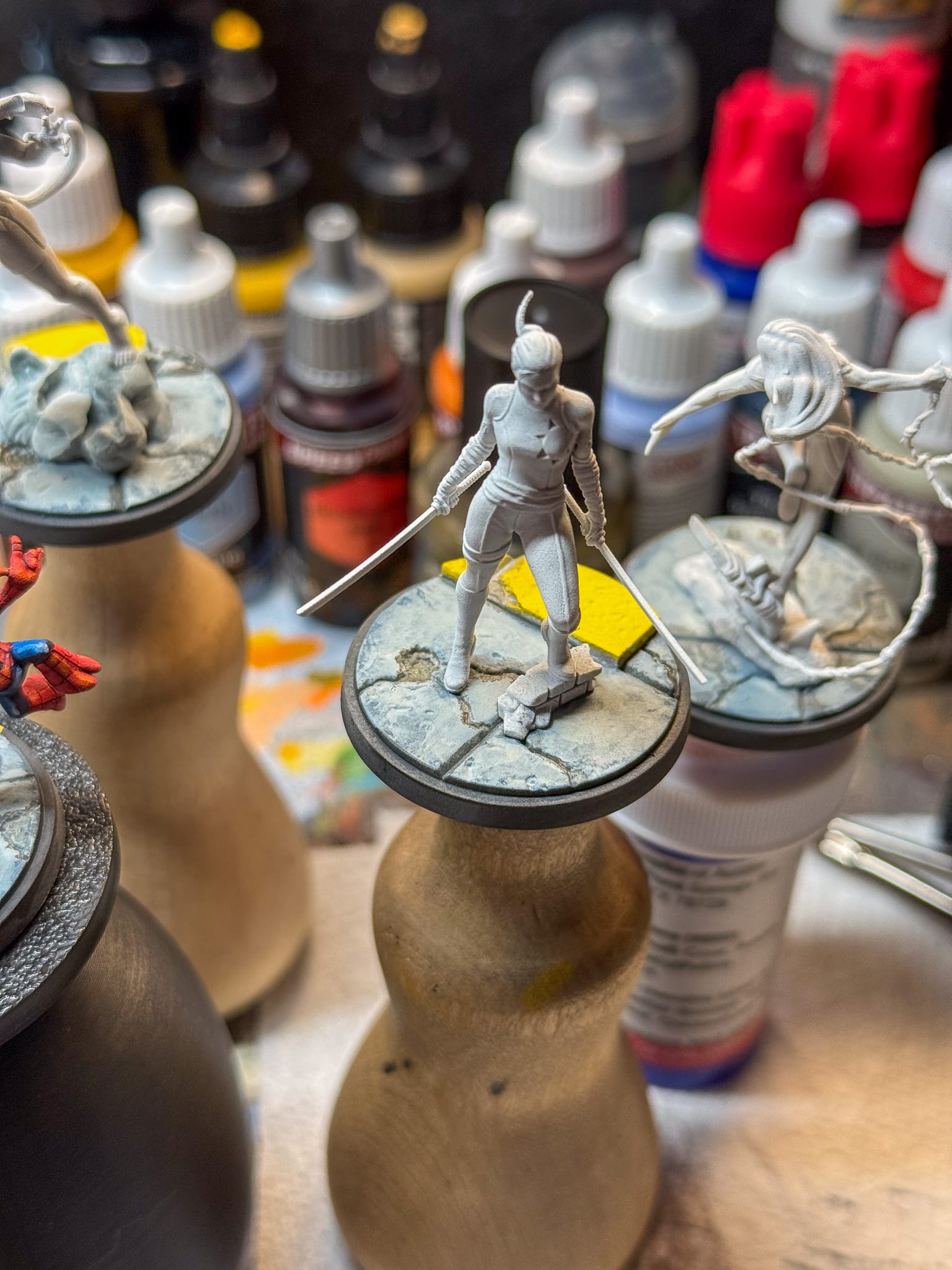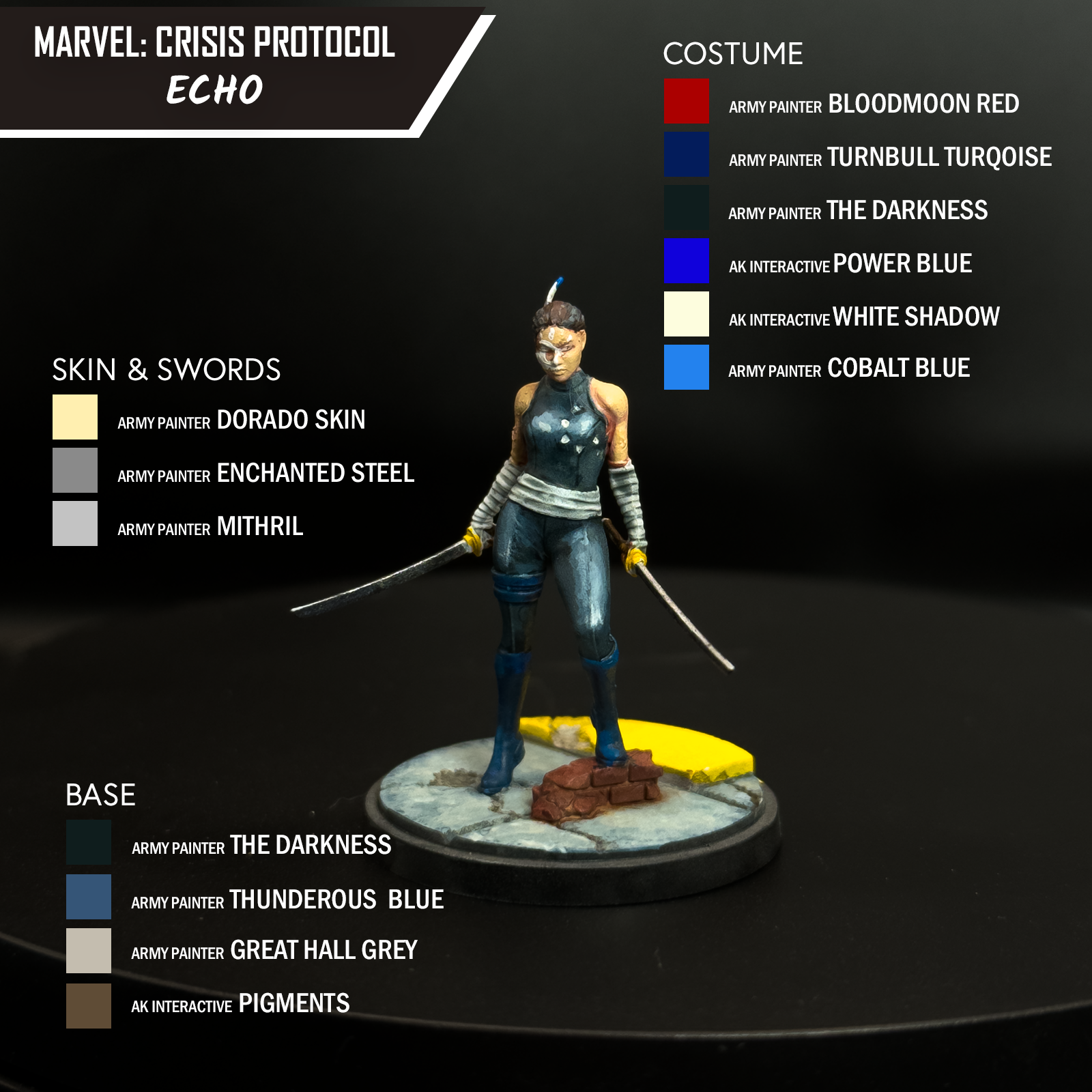 Tigra has a lion head statue she’s leaping off of, and while the box art depicts the lion with a reddish color, I opted to stick more traditional approach, painting the head a concrete gray color. I didn’t write down what I used, but you can start with a mix of 50/50 black and white and work your way down and up from there.On Echo, the swords got Plate Metal Steel, and then a mix of Broadsword Silver for the parts in shadow. Moonbeam Yellow for the hilts. The bricks that she is standing on are a mix of Ruddy Umber and Vermillion, hit with an AK dirt enamel wash to simulate the dust that appears on the brick.