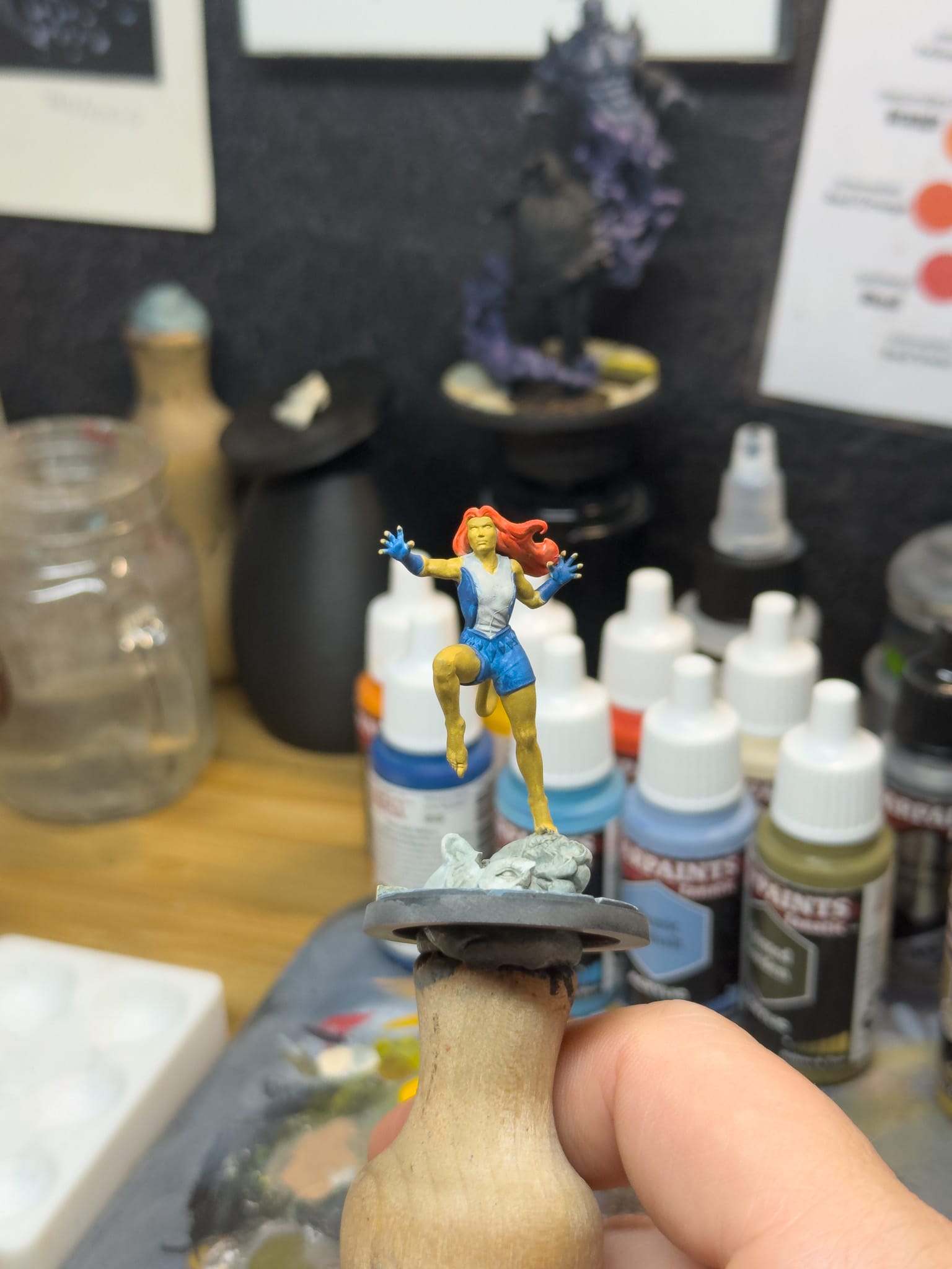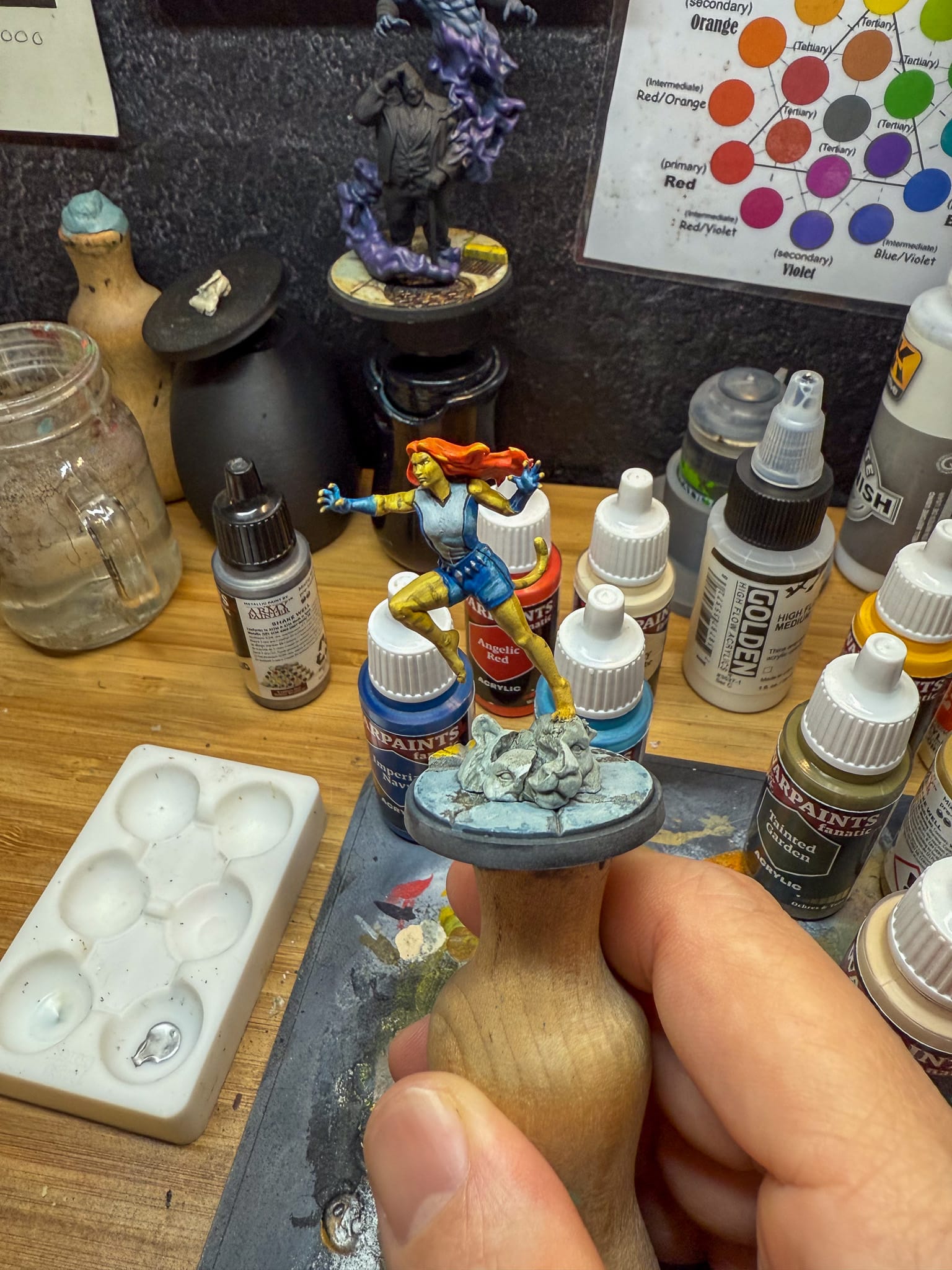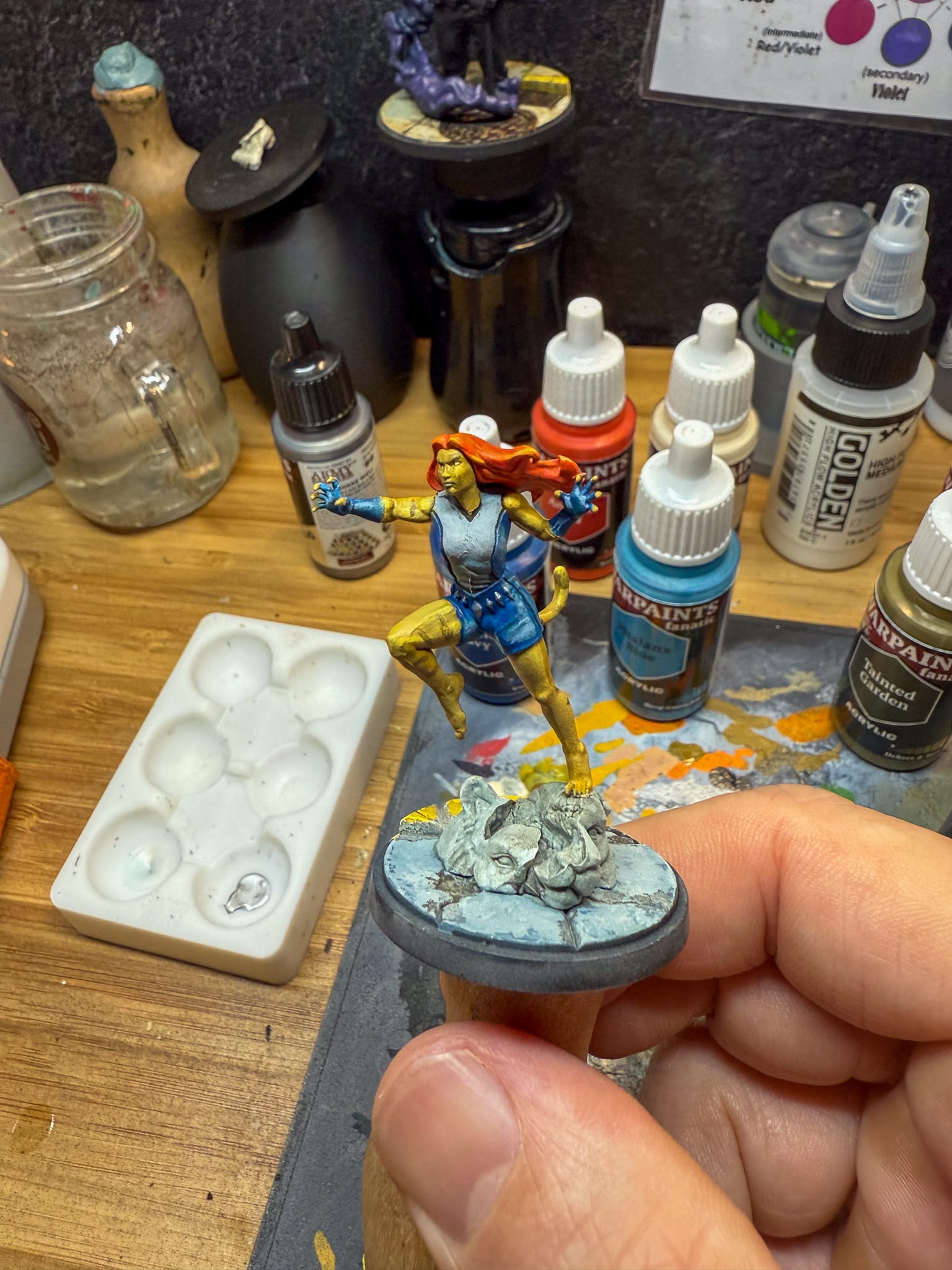 Easy peasy in this case. On Echo, I repeated the same technique I used on some previous models, mixing in Ivory White with Runic Cobalt. For the skin, like on Silk, Dorado with Ivory White. On Tigra, all of the blues got more cobalt and Ivory white mixed in, and Ivory White got mixed into the yellows. Once you find a universal highlight color, it really helps create unity across a subject. For the final highlights on Tigra, Ice Yellow building up to Ivory White, with final speculative highlights thanks to Golden’s Titanium White.
