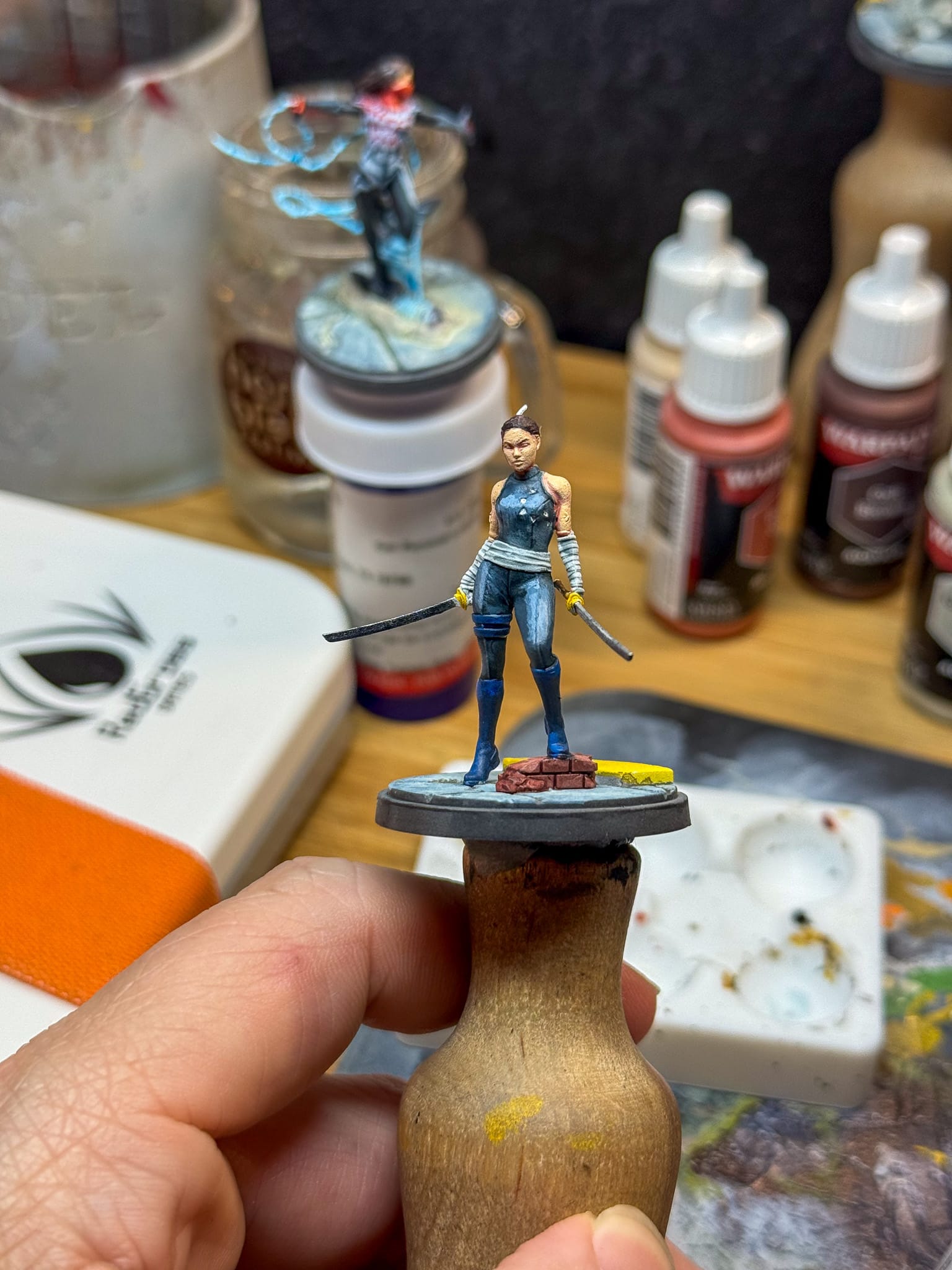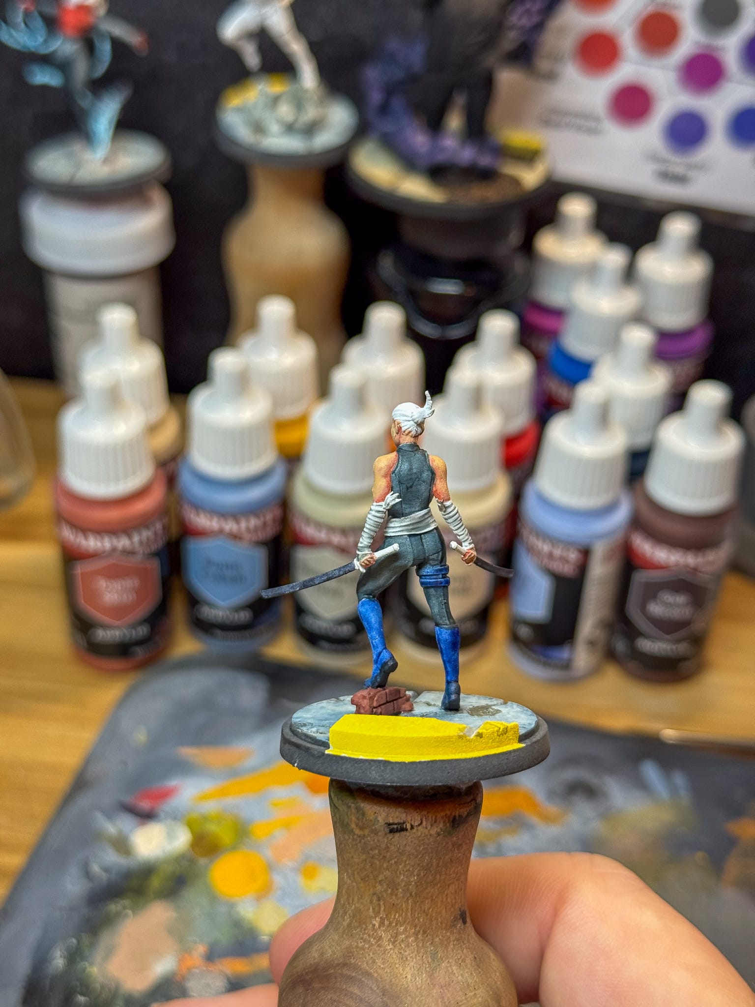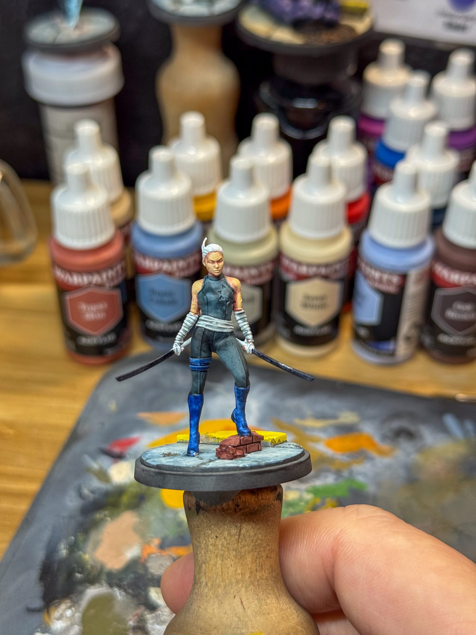 Easy peasy in this case. On Echo, I repeated the same technique I used on some previous models, mixing in Ivory White with Runic Cobalt. For the skin, like on Silk, Dorado with Ivory White. On Tigra, all of the blues got more cobalt and Ivory white mixed in, and Ivory White got mixed into the yellows. Once you find a universal highlight color, it really helps create unity across a subject. For the final highlights on Tigra, Ice Yellow building up to Ivory White, with final speculative highlights thanks to Golden’s Titanium White.